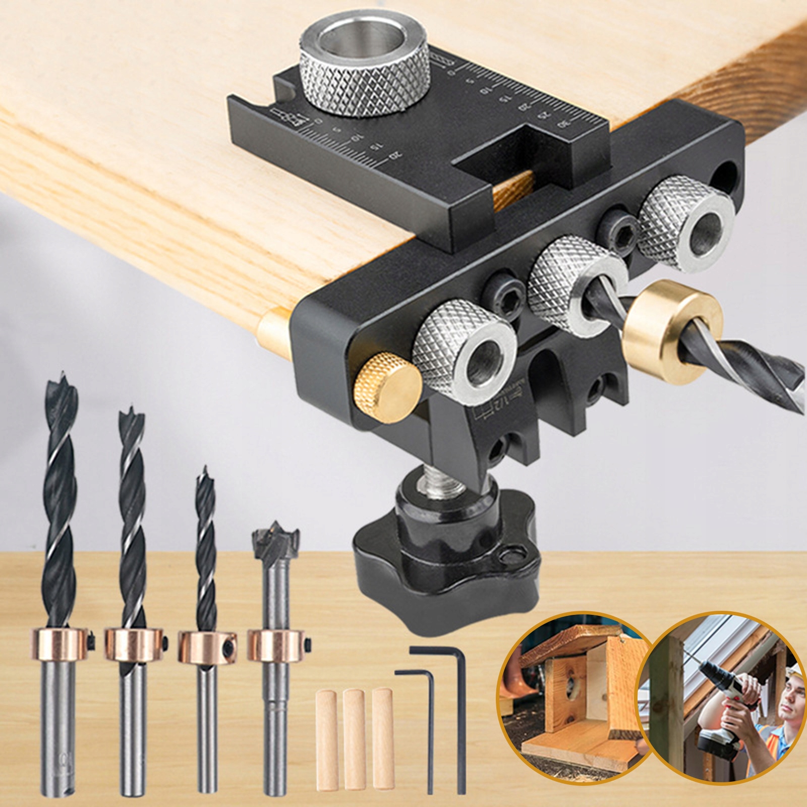 【Набір】 Verstellbare dowel jig umfasst 1 3-W-1 Taschenloch-jig, 1 Messing-Advanced, 3 Bohrer, 3 Bohrer, 3 Bohrer (8 мм*2, 10 мм*, 15 мм*1), 3 Holzdübel, 2 secshskantschssel.