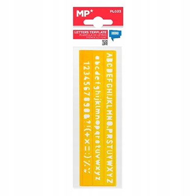 пластиковий шаблон з отворами у формі літер і цифр. Виготовлений з прозорого помаранчевого пластику. Шаблон містить надруковані, написані, цифри та спеціальні символи. Легка лінія буде використовуватися як в студії дизайну, так і в технічному малюнку та художньому просторі. Дірки в шаблоні висотою близько 7 мм. Довжина правителя становить 16,5 див.