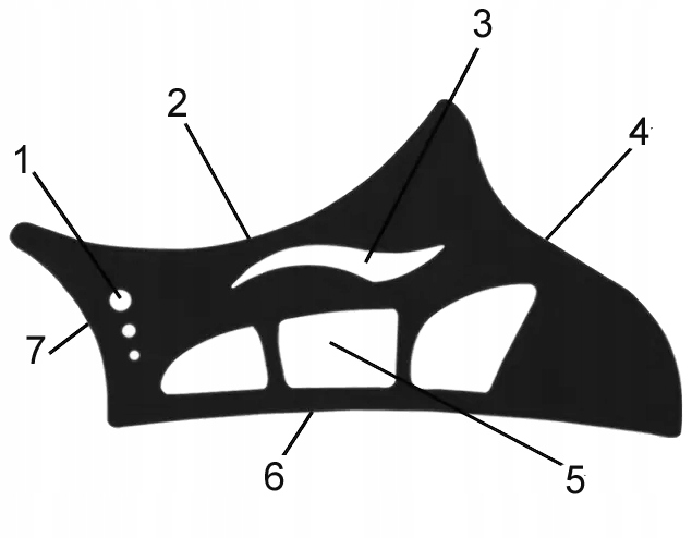 - 5 – ШАБЛОН БРІВ / ВІДРІЗАНА СКЛАДКА: Центральний виріз, який ідеально підходить для швидкого заповнення брів або, якщо розміщено на повіці, для точного позначення лінії згину (Cut Crease).