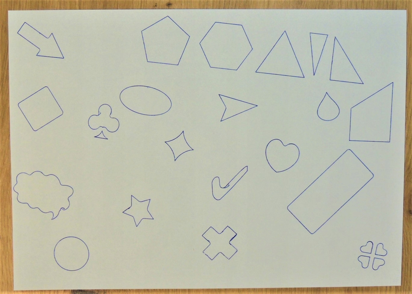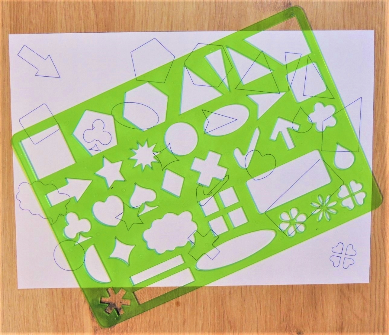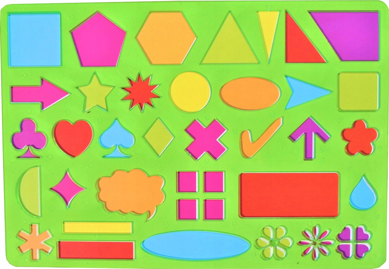 Шаблон містить, серед іншого, такі фігури, як квадрат, трикутник, коло, коло, трапеція, стрілки, квіти, конюшина, хмара, півколо, зірки, шестикутник, мінус, знак ствердження, карткові цифри.