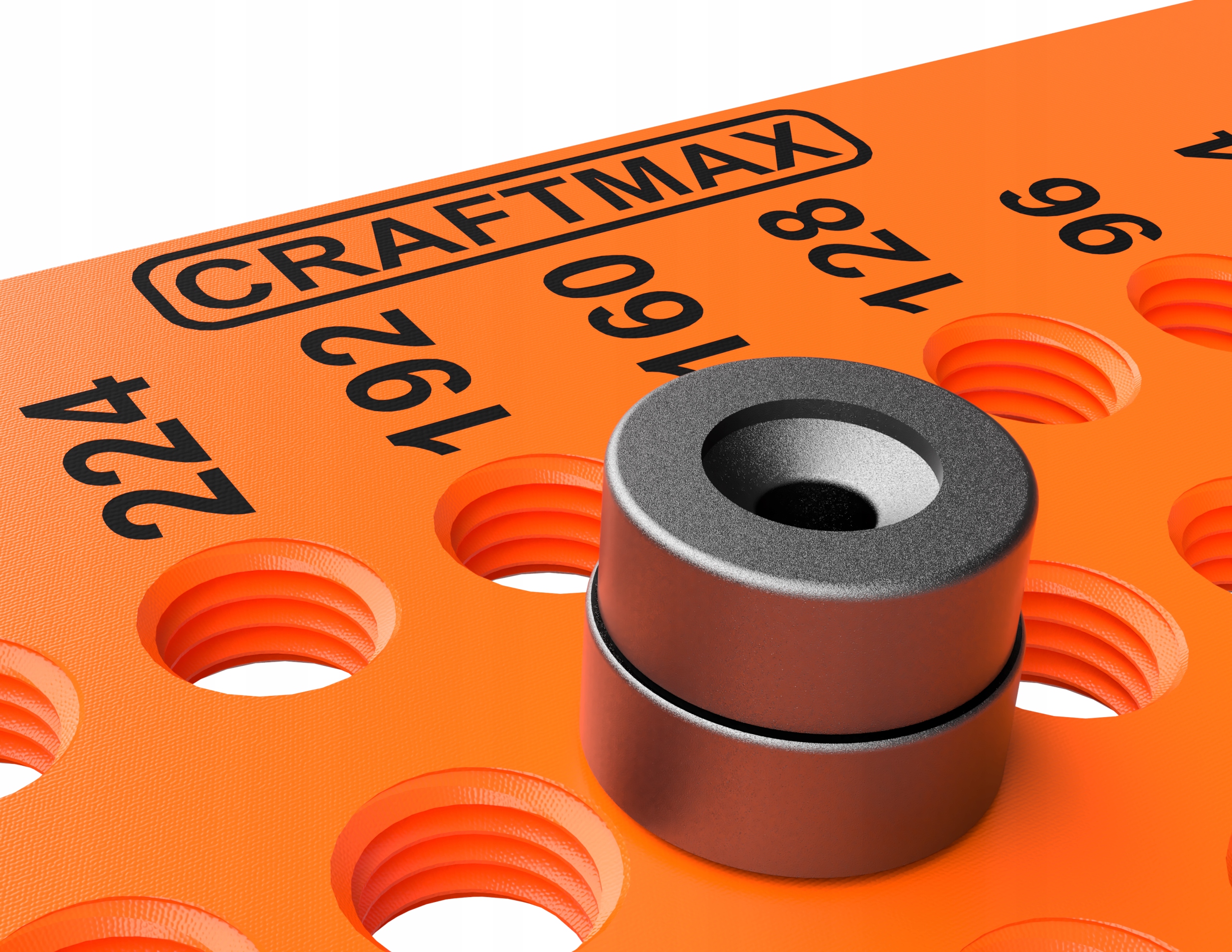 Точний шаблон, що дозволяє швидко й точно свердлити отвори для меблевих ручок на відстані до 320 мм. Має чотири ряди різьбових отворів, в які вкручується втулка свердла. Завдяки цьому користувач може легко відрегулювати положення свердління відповідно до бажаної відстані та типу установки - просто загвинтіть втулки у відповідних місцях відповідно до вибраного розташування.