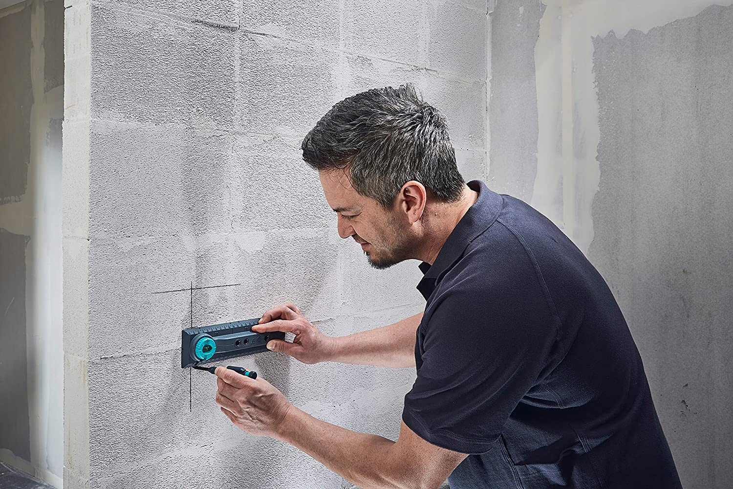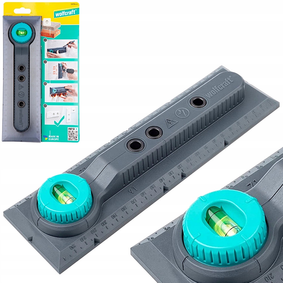 - Рівень, повернутий під кутом 90° до горизонтального та вертикального налаштування шаблону для точного розмічання позиції свердління та позиціонування інсталяційних коробок та аксесуарів