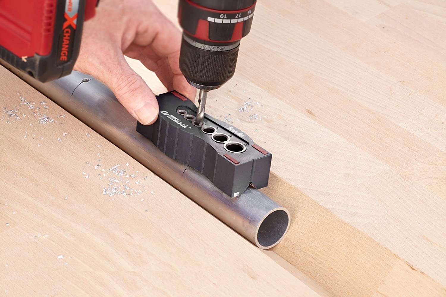 - Універсальність: свердління під прямим кутом у круглих матеріалах, на кутах або просто під кутом 90° на поверхні: жодних проблем із мобільним шаблоном для свердління від kwb