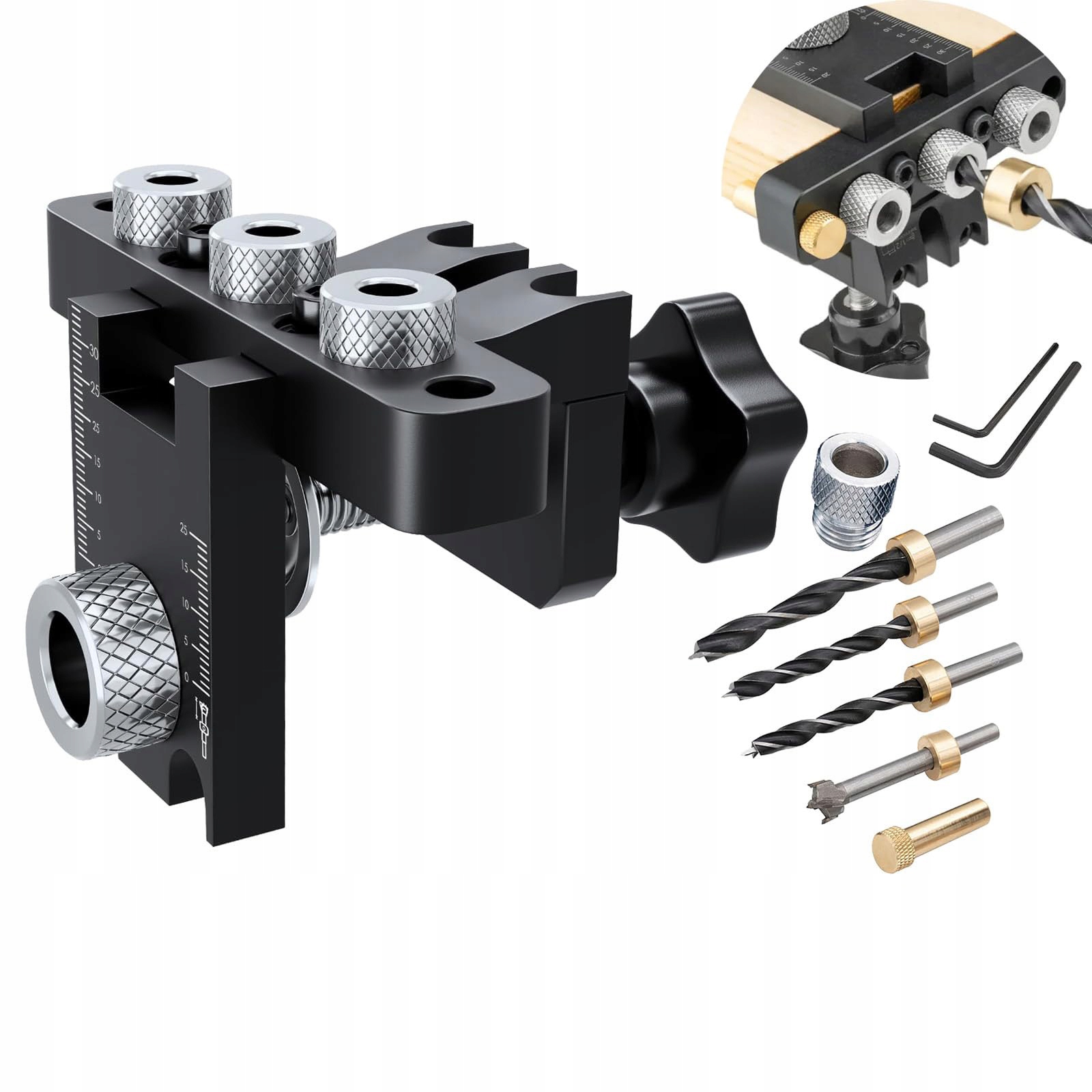 【Повний набір】Регульований шаблон для дюбелів включає шаблон для отворів 3-в-1, латунний упор, три свердла (8 мм x 2, 10 мм x 1, 15 мм x 1), три дерев’яні дюбелі та два шестигранні ключі.