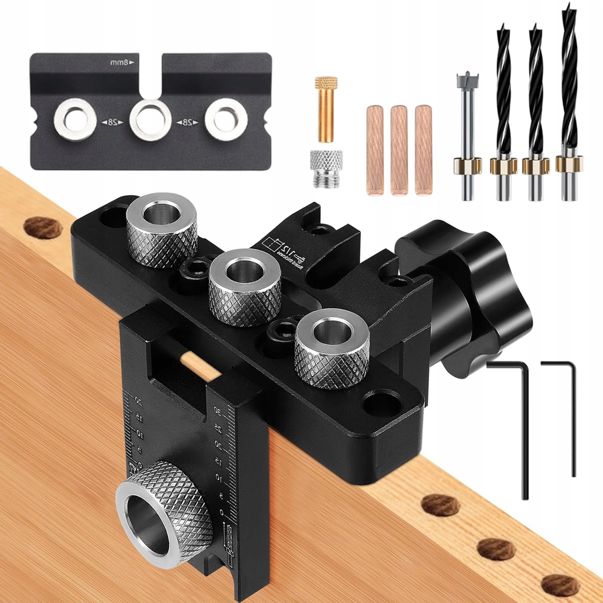 - Регульований штифтовий затискач включає 1 кишеньковий затискач 3-в-1, 1 латунний упор, 3 свердла (8 мм, 10 мм, 15 мм), 3 дерев’яні дюбелі, 2 шестигранні ключі, 1 попередньо встановлений зажим допоміжний для позиціонування.