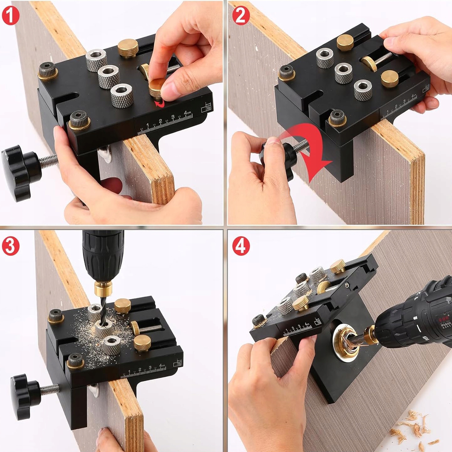 - Набір джигів 3 в 1 для свердління потайних і вертикальних отворів.
