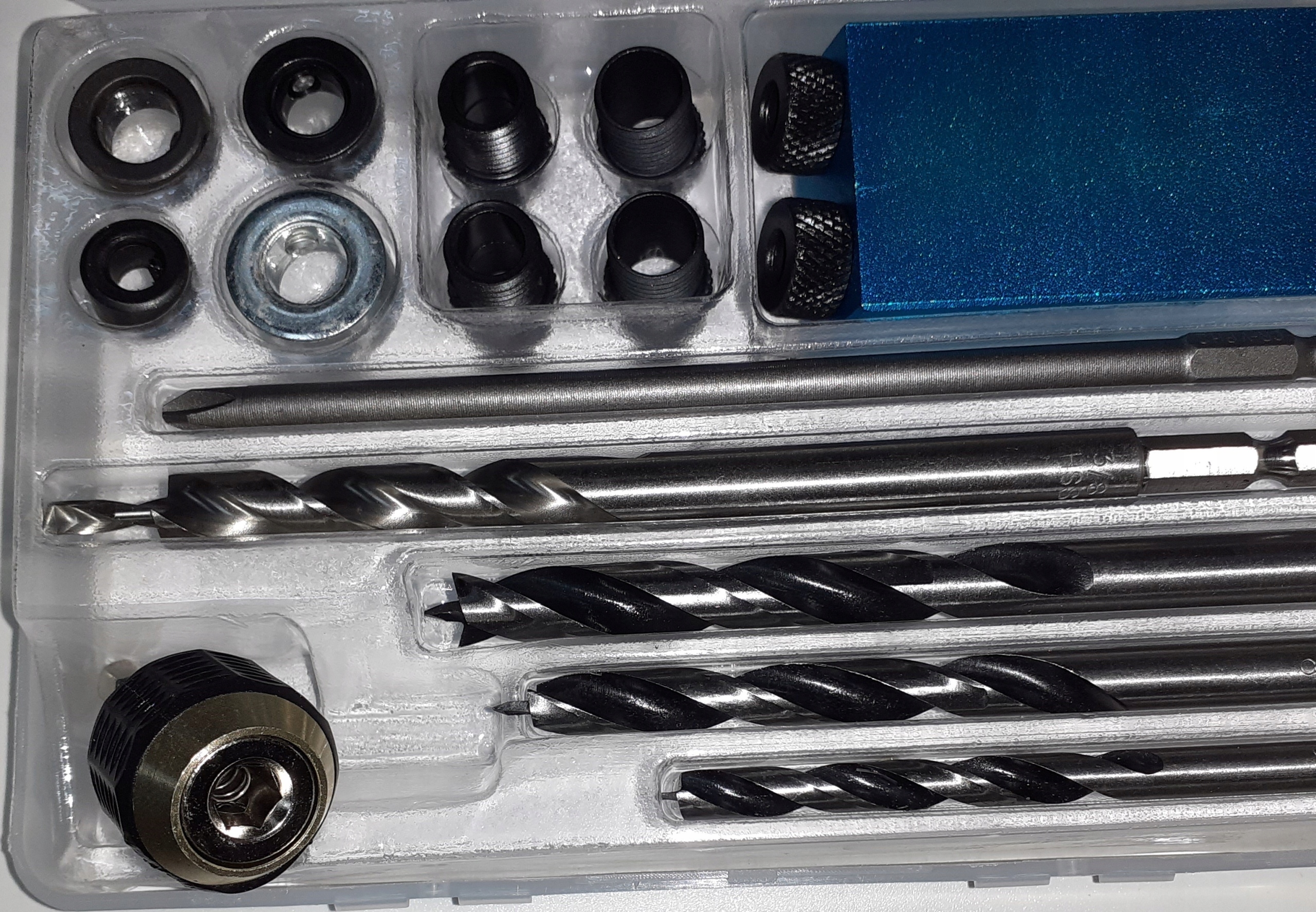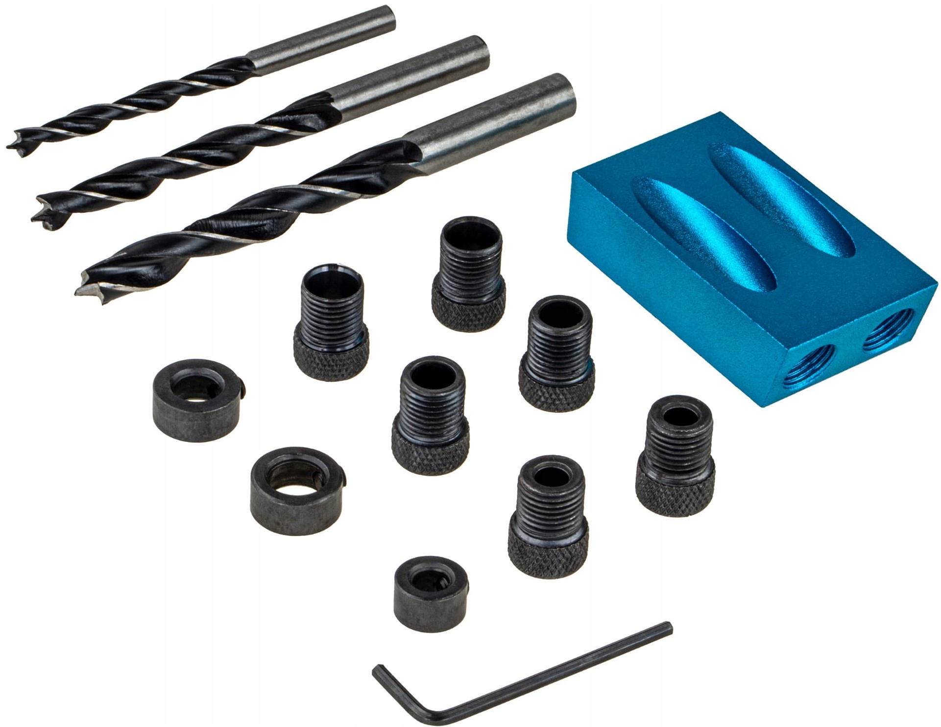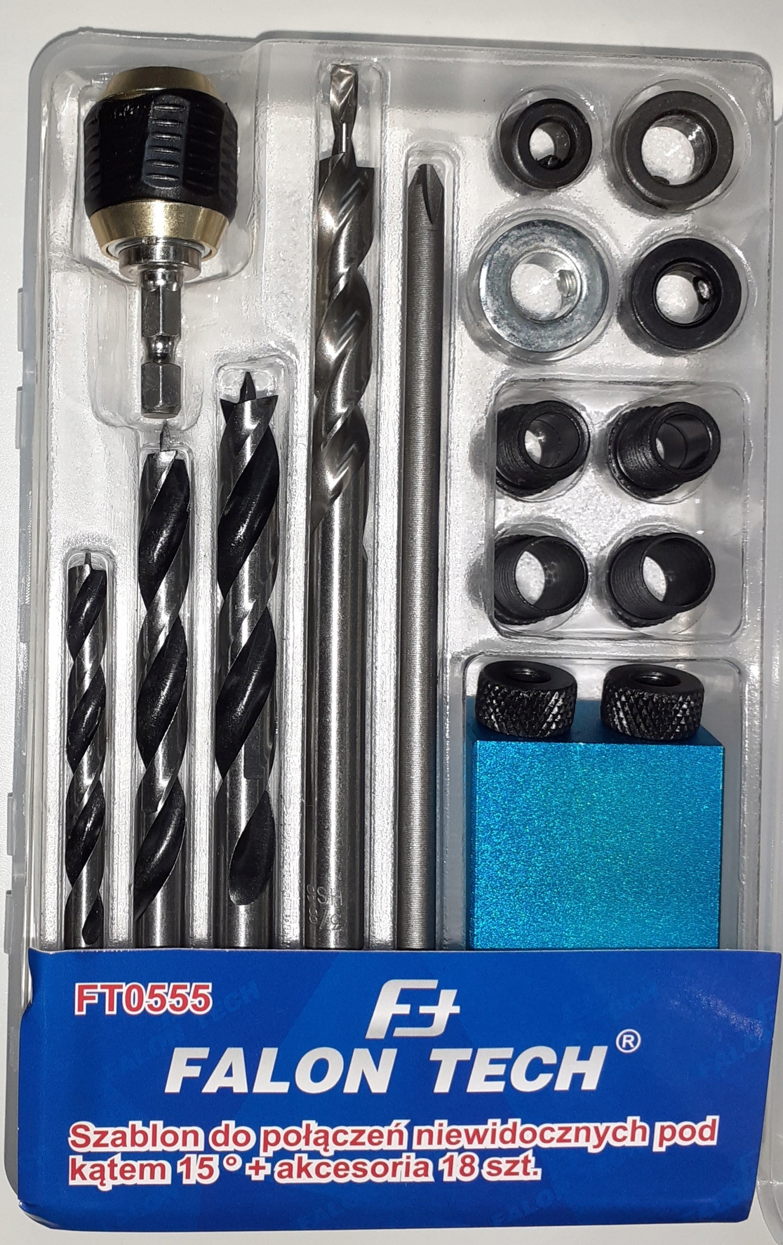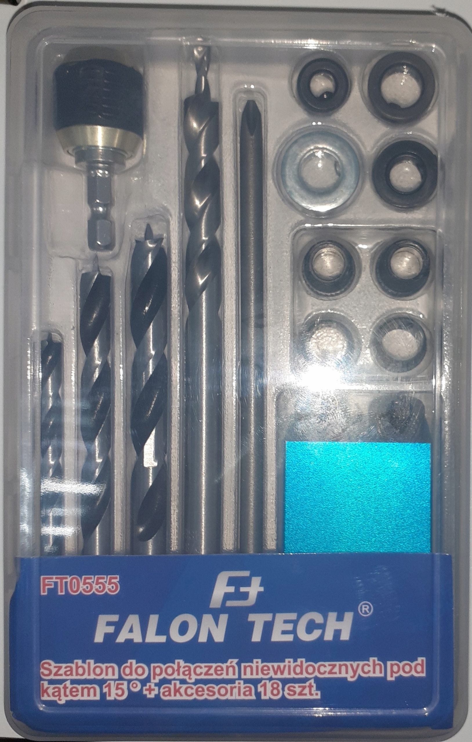 - Блістер містить 18 елементів, серед яких: шестигранний ключ, шаблон для свердління, три свердла. різного діаметру (10, 8 і 6 мм), накладки та шурупи.
