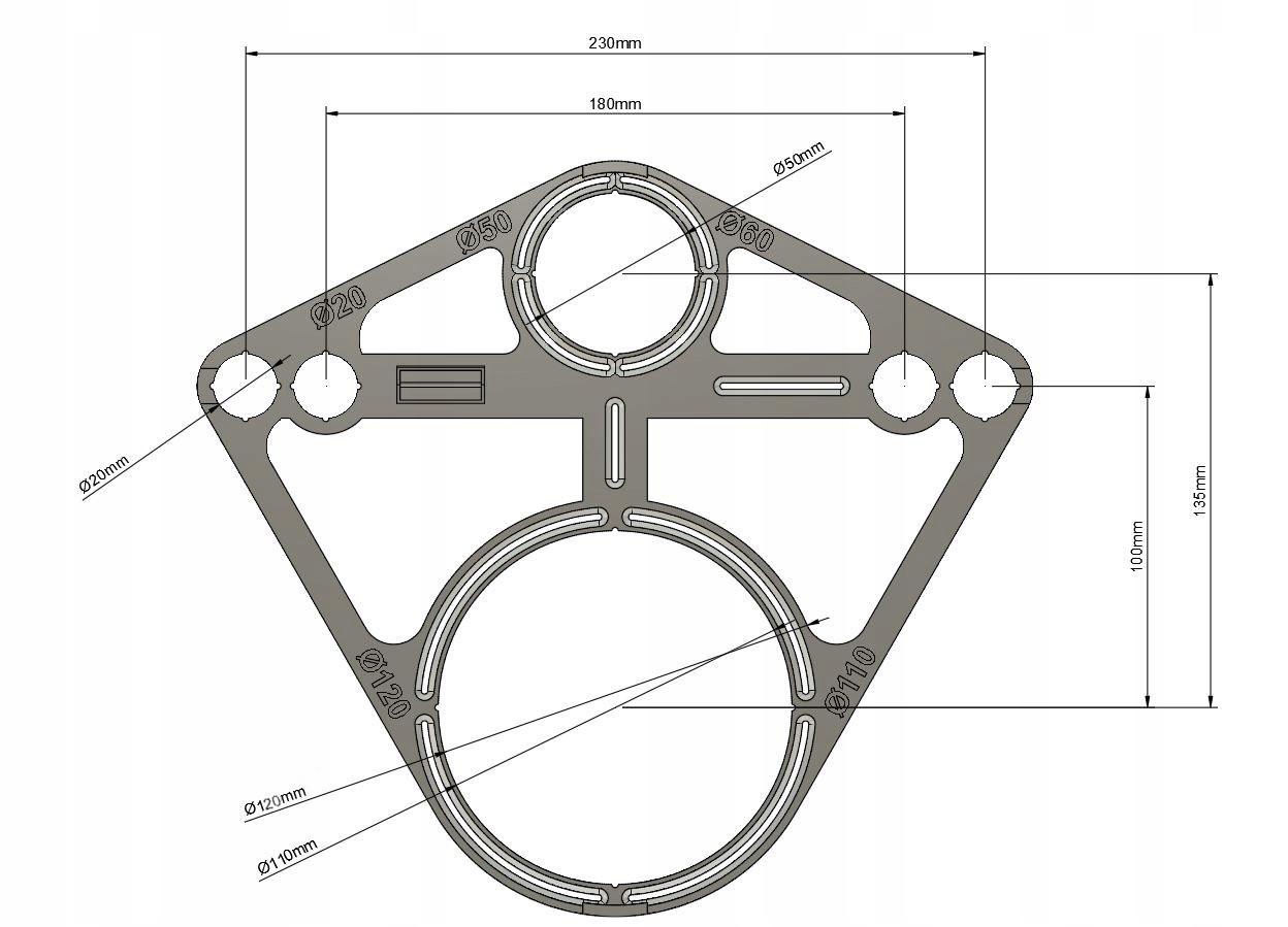 Ця спеціалізована міра сумісна з двома типами відстані між штифтами: 180 мм і 230 мм b> . Крім того, він має отвори діаметром 20 мм, 50 мм, 60 мм, 110 мм і 120 мм b > які належним чином позначені для легкої ідентифікації. Додаткові схили та маркери рівня дозволяють ідеально встановити лінійку.