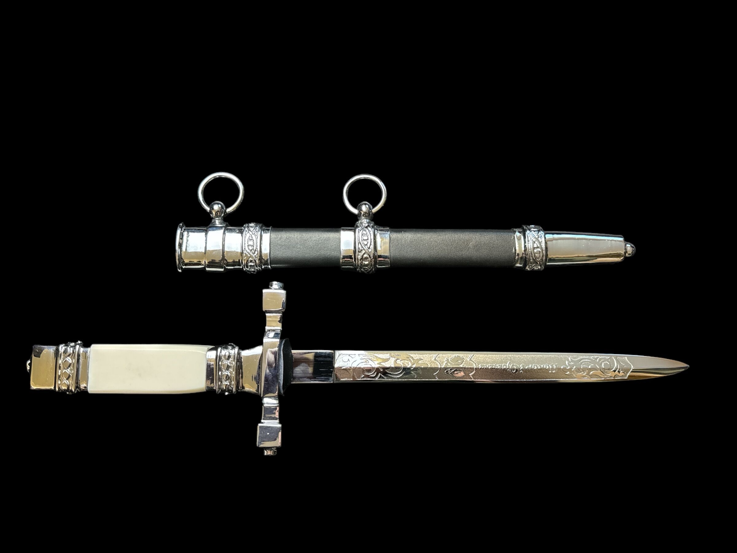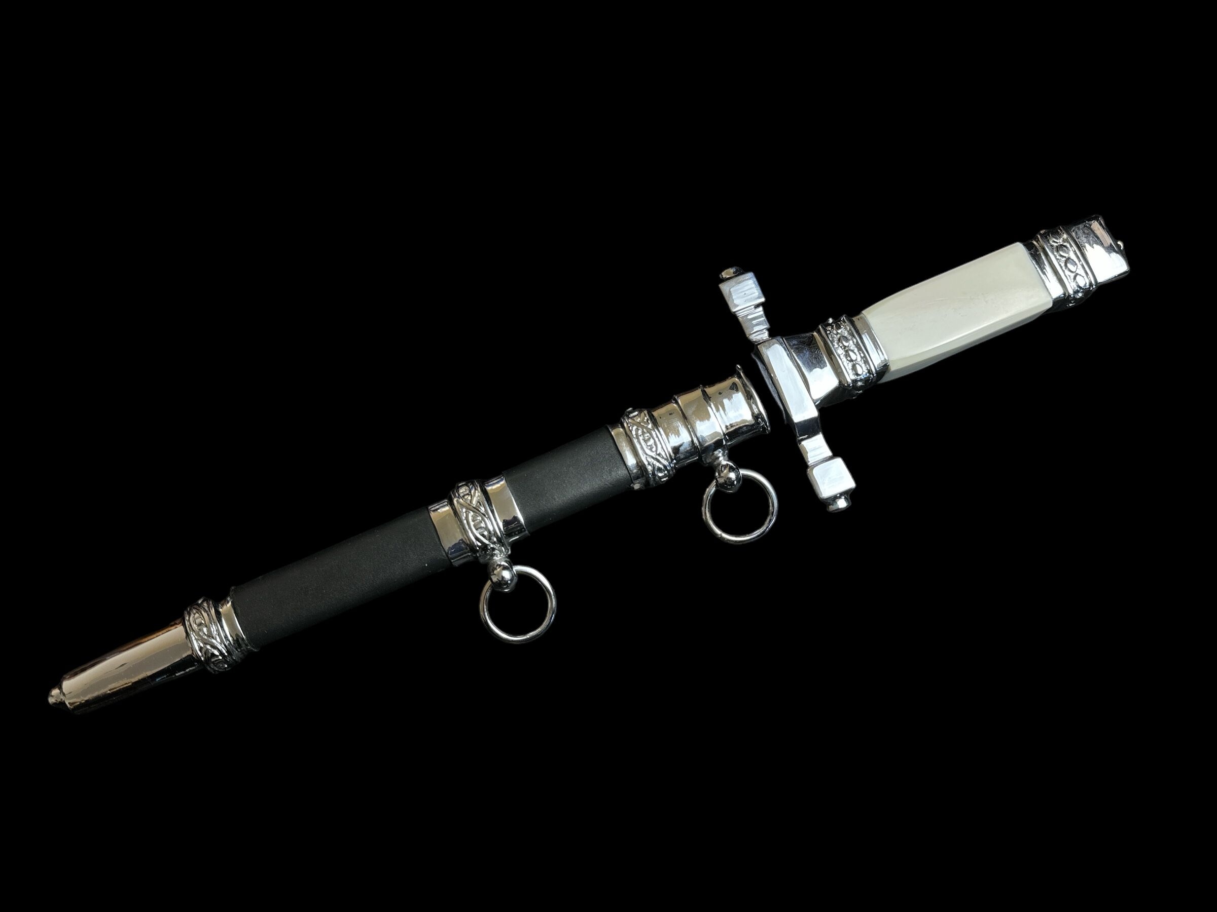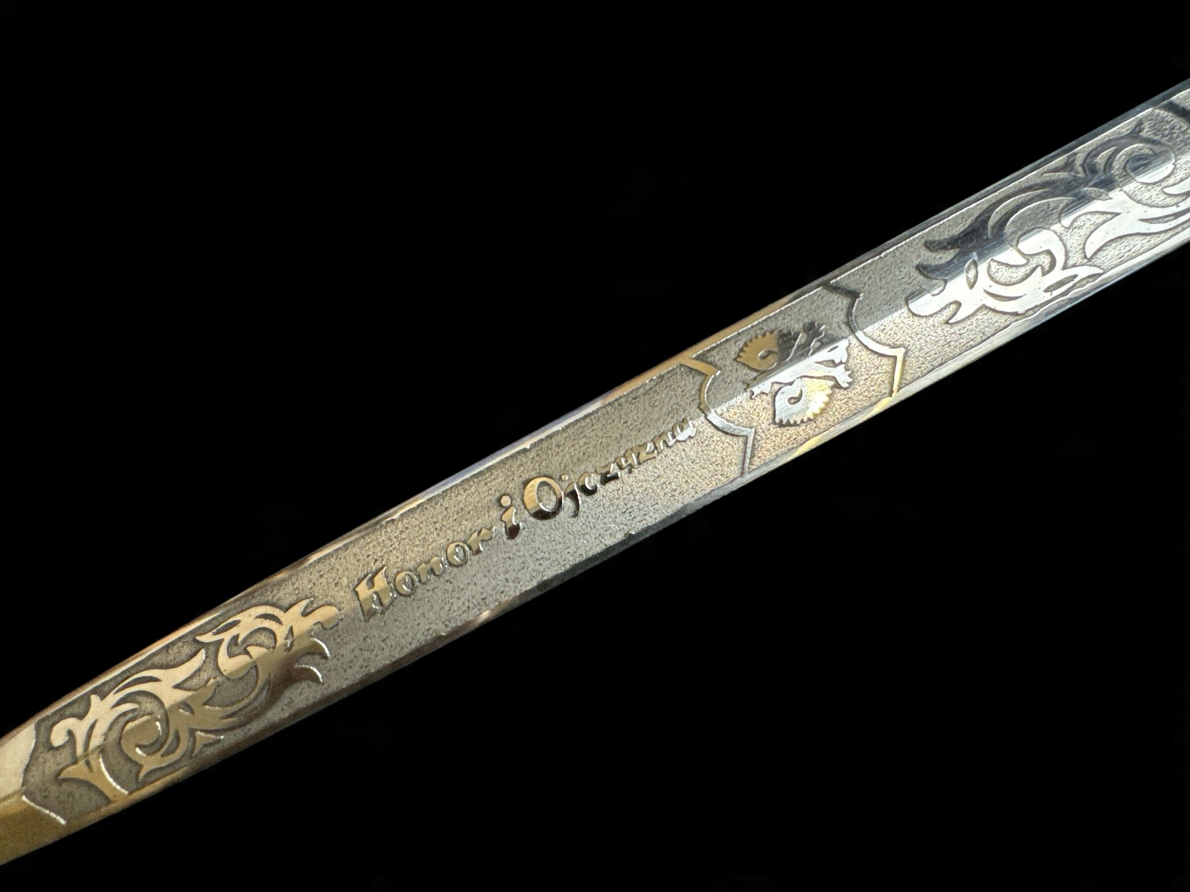 Поліроване нікельоване лезо з високовуглецевої сталі з ромбовидним перерізом. Довгий лад, центричне гравіювання. На зовнішній поверхні вигравіруваний орнамент із зображенням державного герба та написом «Честь і Батьківщина». Пряма профільована хрестовина з центральним розширенням і чотиригранними наконечниками. Поперечний перетин хрестовини чотиригранний, за винятком напівкруглих кінців рамен. Нижнє кільце древка чотиригранне, розширене донизу з декоративним кільцем угорі з орнаментом. Ручка біла, прямокутна, з поперечним перерізом і закругленими краями. Голова з декоративним кільцем з орнаментом. Металеві елементи: ручки з нікельованої сталі. Піхви овального перерізу, дерев'яні, з чорною шкіряною курткою і трьома сталевими нікельованими фурнітурами. Верхня фурнітура з дугоподібним вхідним манжетом, гладкою виточкою з ланкою і рухомим опорним колесом, внизу декоративним кільцем з орнаментом. Центральна арматура з пазом, прикрашеним орнаментом, з ланкою та рухомим опорним колесом. Нижня обувка – туфелька з декоративним каблучком з орнаментом лаврового листя з плоским кінцем та розміщеним на ньому сплощеним набалдашником.