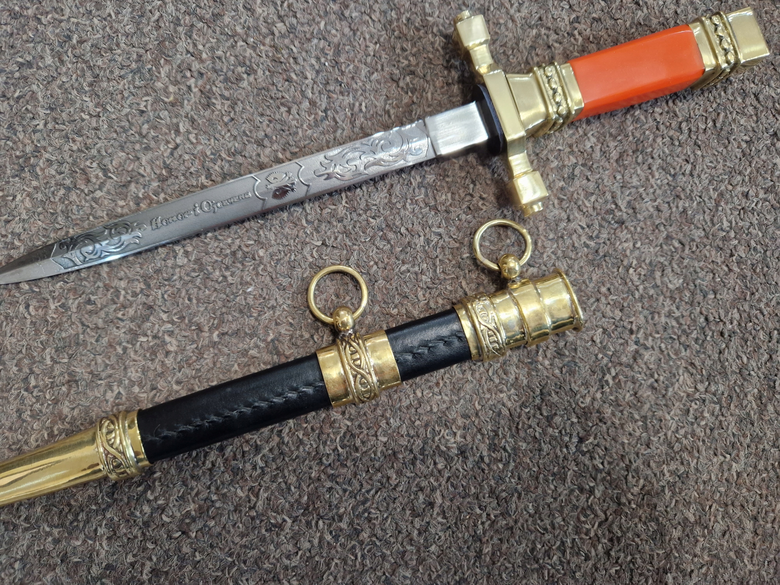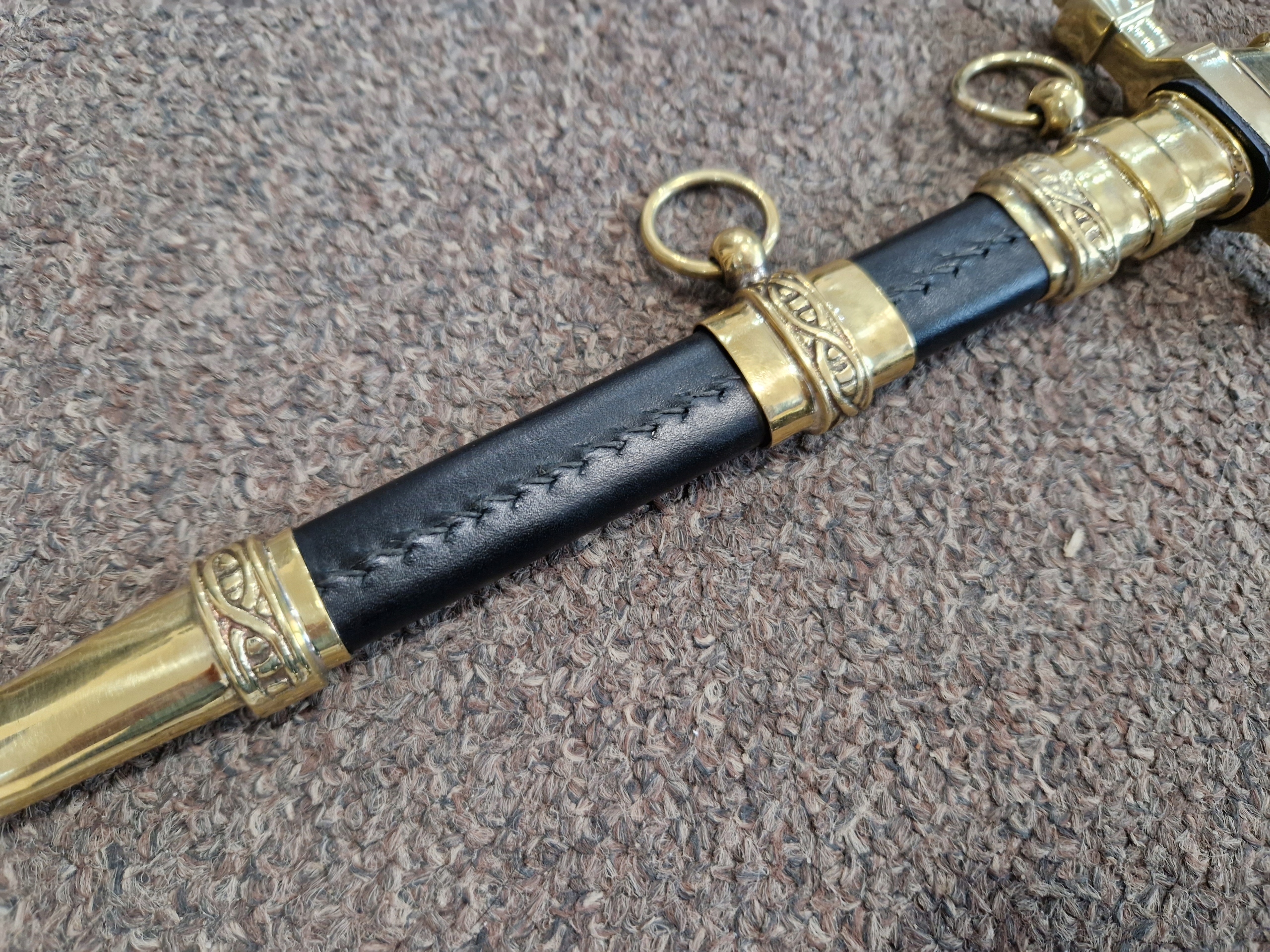 Поліроване лезо з високовуглецевої сталі з ромбовидним перерізом. Довгий лад, центричне гравіювання. На зовнішній поверхні вигравіруваний орнамент із зображенням державного герба та написом «Честь і Батьківщина». Пряма профільована хрестовина з центральним розширенням і чотиригранними наконечниками. Поперечний перетин хрестовини чотиригранний, за винятком напівкруглих кінців плечей. Нижнє кільце древка чотиригранне, розширене донизу з декоративним кільцем угорі з орнаментом. Ручка червоно-помаранчева, чотиригранна в перерізі із закругленими краями. Голова з декоративним кільцем з орнаментом. Металеві елементи: латунні ручки. Піхви овального перетину, дерев'яні, з чорною шкіряною курткою і трьома латунними фурнітурами. Верхня фурнітура з дугоподібним вхідним манжетом, гладкою виточкою з ланкою і рухомим опорним колесом, внизу декоративним кільцем з орнаментом. Середня обтяжка з виїмкою, прикрашеною орнаментом, з ланкою і рухомим опорним колесом.