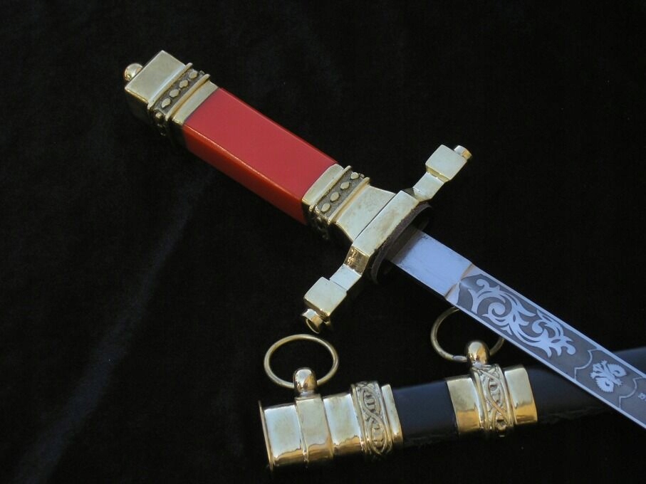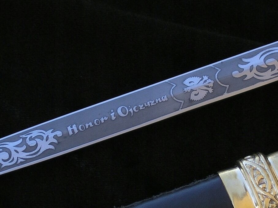 Поліроване лезо з високовуглецевої сталі з ромбовидним перерізом. Довгий лад, центричне гравіювання. На зовнішній поверхні вигравіруваний орнамент із зображенням державного герба та написом «Честь і Батьківщина». Пряма профільована хрестовина з центральним розширенням і чотиригранними наконечниками. У поперечному перерізі хрестовина чотиригранна, за винятком напівкруглих кінців рамен. Нижнє кільце древка чотиригранне, розширене донизу з декоративним кільцем угорі з орнаментом. Ручка червоно-помаранчева, чотиригранна в перерізі із закругленими краями. Голова з декоративним кільцем з орнаментом. Металеві елементи: латунні ручки. Піхви овального перетину, дерев’яні, з чорною шкіряною курткою і трьома латунними фурнітурами. Верхня фурнітура з дугоподібним вхідним манжетом, гладкою виточкою з ланкою і рухомим опорним колесом, внизу декоративним кільцем з орнаментом. Середня обтяжка з виїмкою, прикрашеною орнаментом, з ланкою і рухомим опорним колесом.