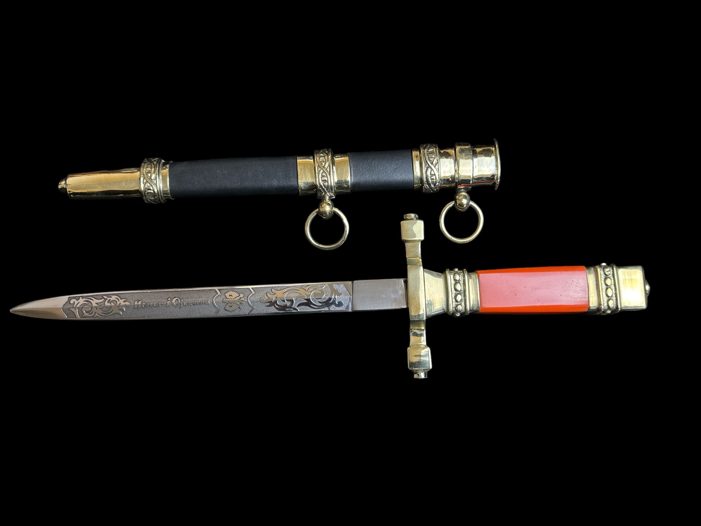 Поліроване лезо з високовуглецевої сталі з ромбовидним перерізом. Довгий лад, центричне гравіювання. На зовнішній поверхні вигравіруваний орнамент із зображенням державного герба та написом «Честь і Батьківщина». Пряма профільована хрестовина з центральним розширенням і чотиригранними наконечниками. Поперечний перетин хрестовини чотиригранний, за винятком напівкруглих кінців рамен. Нижнє кільце древка чотиригранне, розширене донизу з декоративним кільцем угорі з орнаментом. Ручка червоно-помаранчевого кольору, чотиригранна в перерізі із закругленими краями. Голова з декоративним кільцем з орнаментом. Металеві елементи: латунні ручки. Піхви овального перетину, дерев'яні, з чорною шкіряною курткою і трьома латунними фурнітурами. Верхня фурнітура з дугоподібним вхідним манжетом, гладкою виточкою з ланкою і рухомим опорним колесом, внизу декоративним кільцем з орнаментом. Середня обтяжка з виїмкою, прикрашеною орнаментом, з ланкою і рухомим опорним колесом.