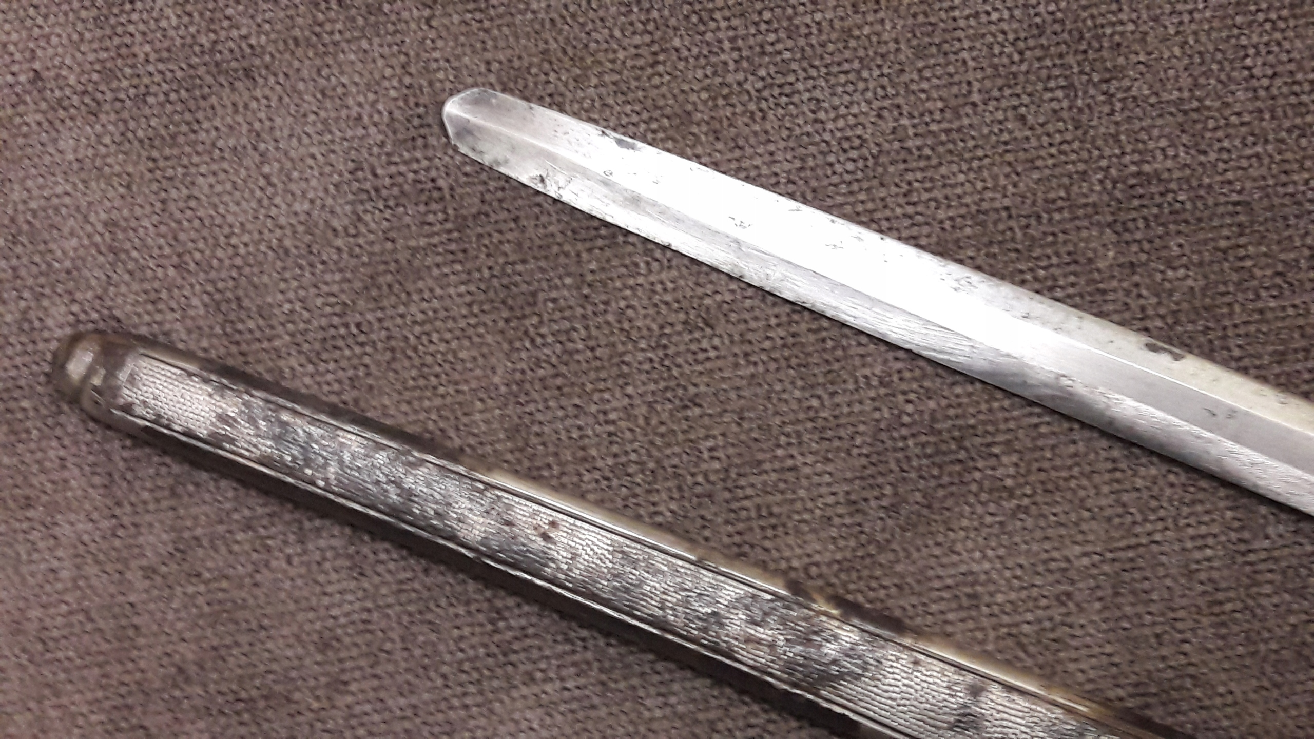 Знак хреста на клинку. під ручкою видно прямокутник.