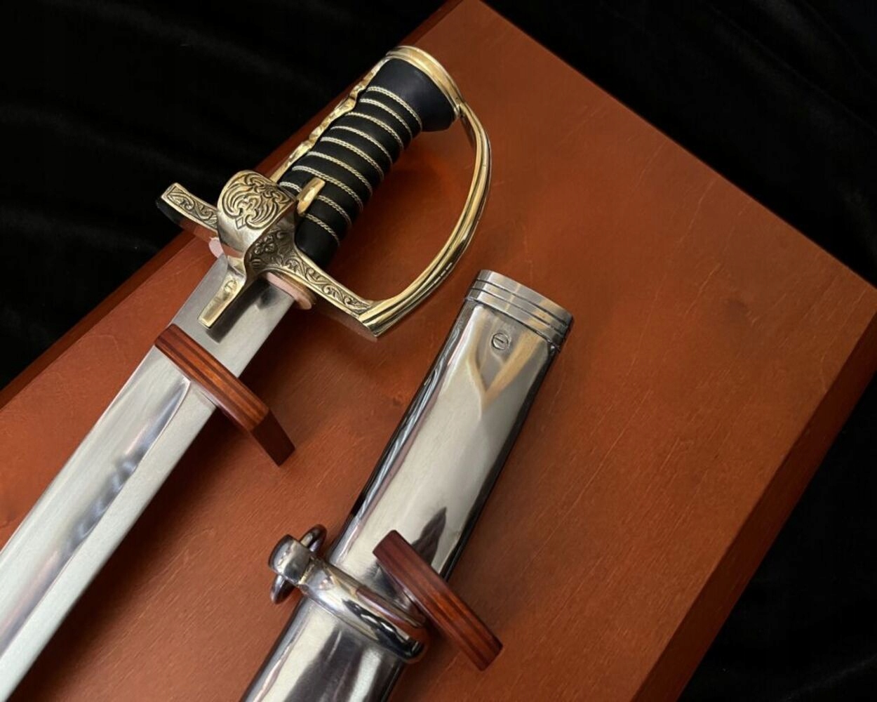 Піхви: ПОЛІРОВАНА ВУГЛЕЦЕВА СТАЛЬ (потребує обслуговування). Піхви зсередини обшиті шкірою. Ви можете тримати шаблю в піхвах, не турбуючись про корозію.