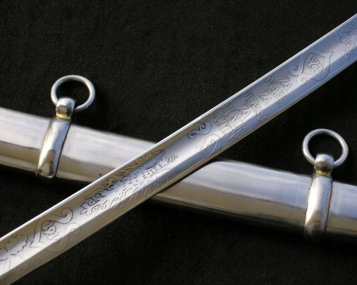 На внутрішній стороні клинка в картуші, прикрашеному дубовим листям, викарбувано літери L.P., напис 6 / VIII / МИ / ПЕРША / БРИГАДА, внизу на тлі перехрещених шабель, рушниць і ствола гармати, нагрудний знак «За вірну службу» та дата 1914 р.