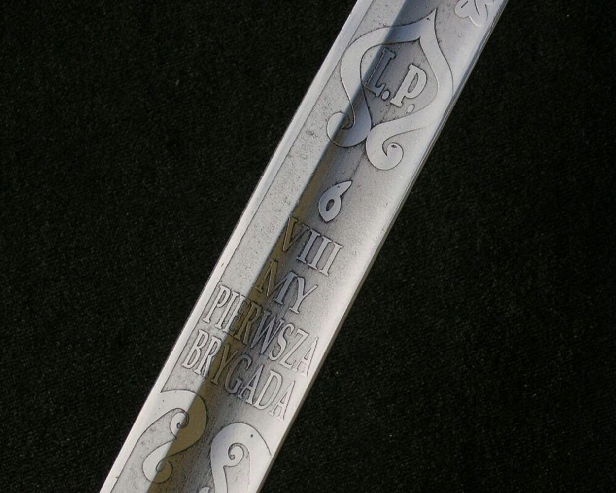 Поліроване сталеве лезо, з невеликою кривизною, відшліфоване з обох боків у єдиний шар. Перо з сильно вираженою спинною кісточкою, двостороннє, децентричне гравіювання. На внутрішній поверхні клинка в картуші, прикрашеному дубовим листям, викарбувані літери Л.П., напис 6 / VIII / МОЯ / ПЕРША / БРИГАДА, внизу, на тлі перехрещених шаблі, рушниці та ствола гармати, значок « За вірну службу» (заснований Юзефом Пілсудським у серпні 1916 року) і датою 1914.