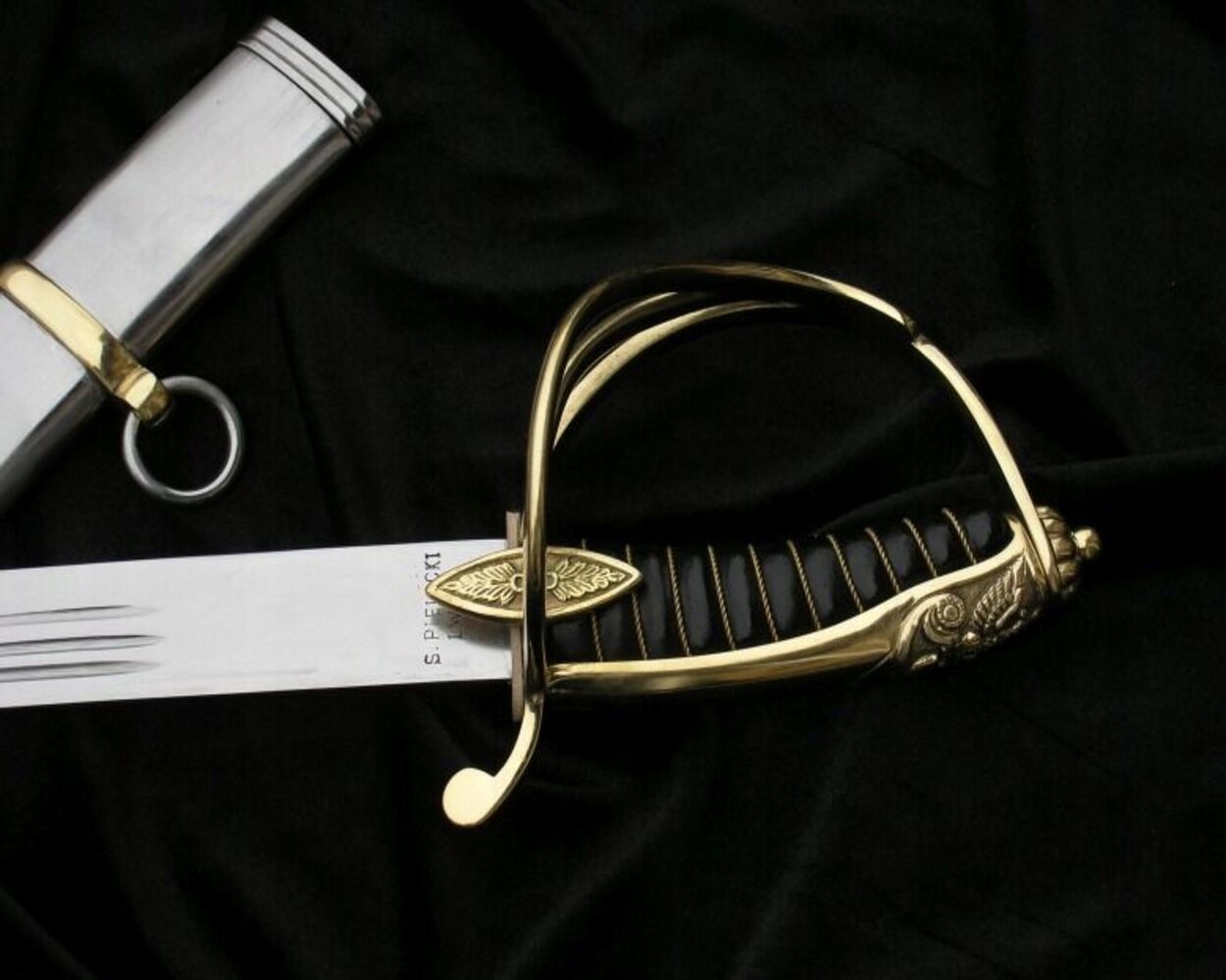 Головка сталева великої кривизни, шліфована з обох боків у три канавки. Плоске, однолезове лезо, дорсальне вістря. На зовнішній стороні леза, біля основи, штампований підпис S.PIELECKI/LWÓW. Поліровані сталеві піхви з двома латунними пазами та рухомими колесами. Асиметрична шпора. Шийка піхви рифлена.