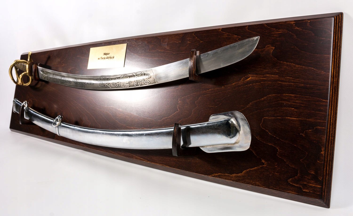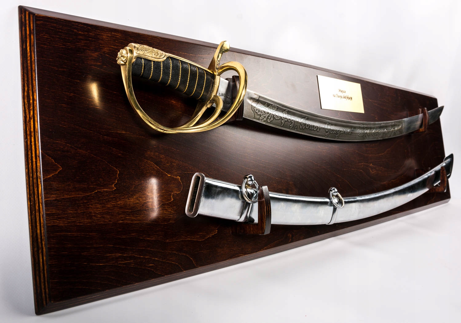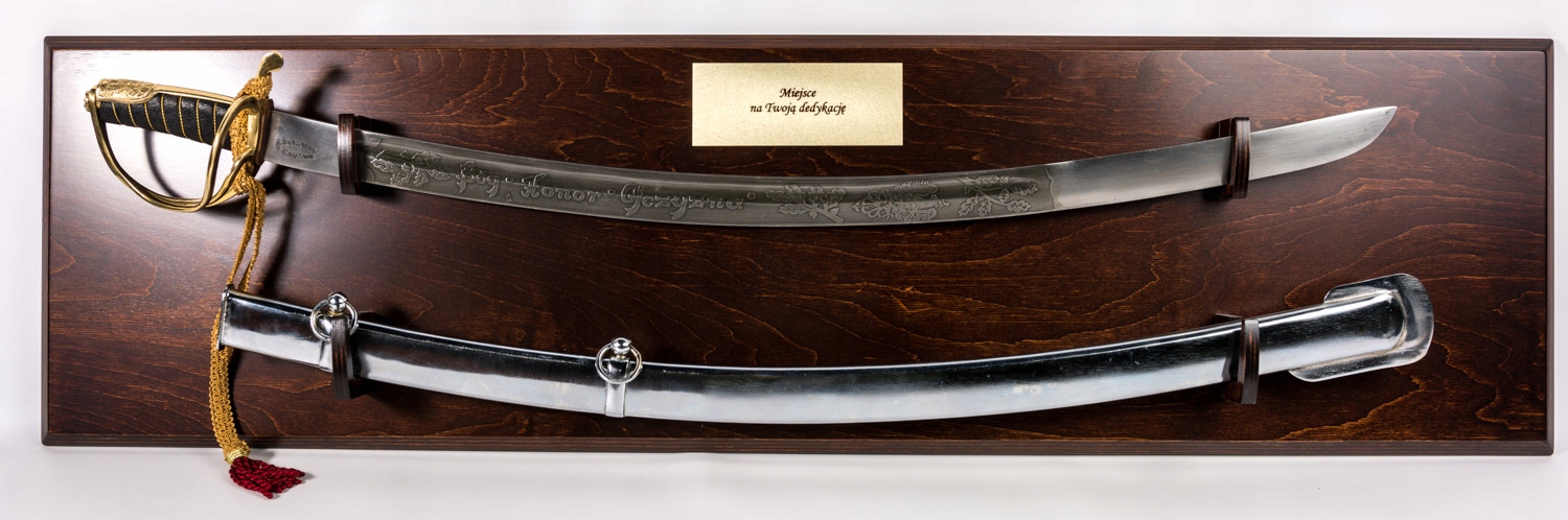 Рукоятка виготовлена з дерева, обшита чорною шкірою, з видимими діагональними канавками, заповненими крученим латунним дротом, т.зв. обрізка. Закрита ручка, латунь, корзина. S-подібна триважільна хрестовина. Клинок виготовлений з високоякісної незагартованої сталі. На зовнішній амфібії гарне гравіювання: Бог, Честь, Вітчизна. На зовнішній поверхні під ковпачком розміщено поршень із заводу Sieczna Weapons Factory Gabriel Borowski: G. BOROWSKI | У ВАРШАВІ. На внутрішній поверхні розташований приймальний поршень Головного Управління Армійського Забезпечення - ГУЗА. До ручки прив'язана декоративна перевязка з тканини, золота стрічка, оброблена червоною китицею - пучком ниток. Піхви з нікельованого листового металу, з двома канавками і рухомими кільцями, що закінчуються шпорою. Чудово зроблена шабля, яка ефектно виглядає на прикладеному столі. Стіл з фанери, вітражений і матовий лак. На задній частині столу є два гачки, які можна повісити на стіну. Робота польського майстра для презентації холодної зброї.
