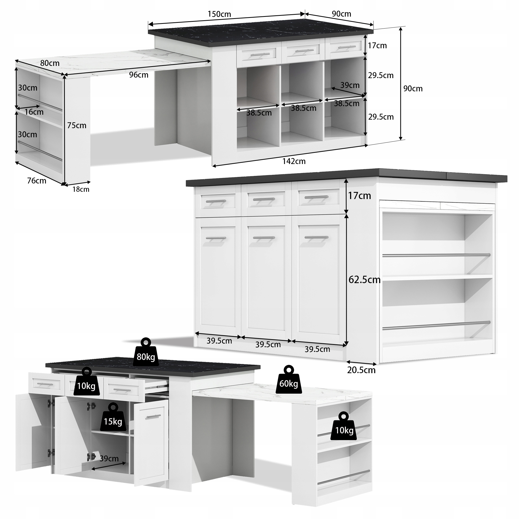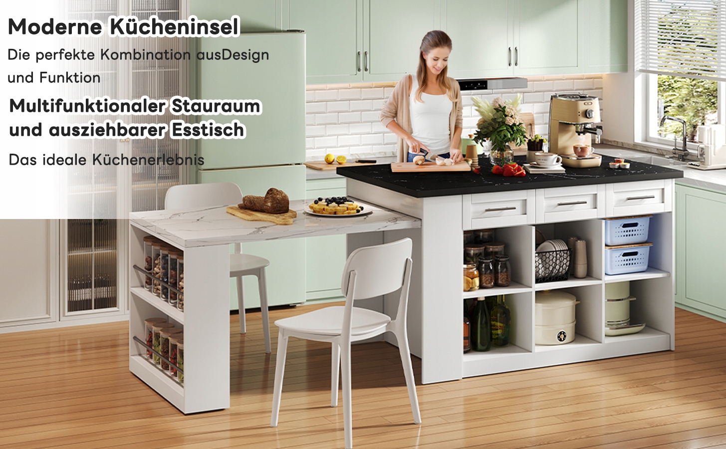 Прихований обідній стіл: обідній стіл (шириною 80 см, висотою 75 см, максимальна довжина 96 см) може бути легко інтегрована з дизайном кухонного острова. Таблицю можна витягнути з -під поверхні одним простим рухом. Дерев’яна стільниця товщиною 3,5 см з білим мармуровим декором забезпечує стабільність і є ідеальним вибором для сімейних страв або соціальних зустрічей. 4 Завдяки цьому, кухонний острів ідеально підходить для повсякденного використання та пропонує надзвичайно приємне використання.