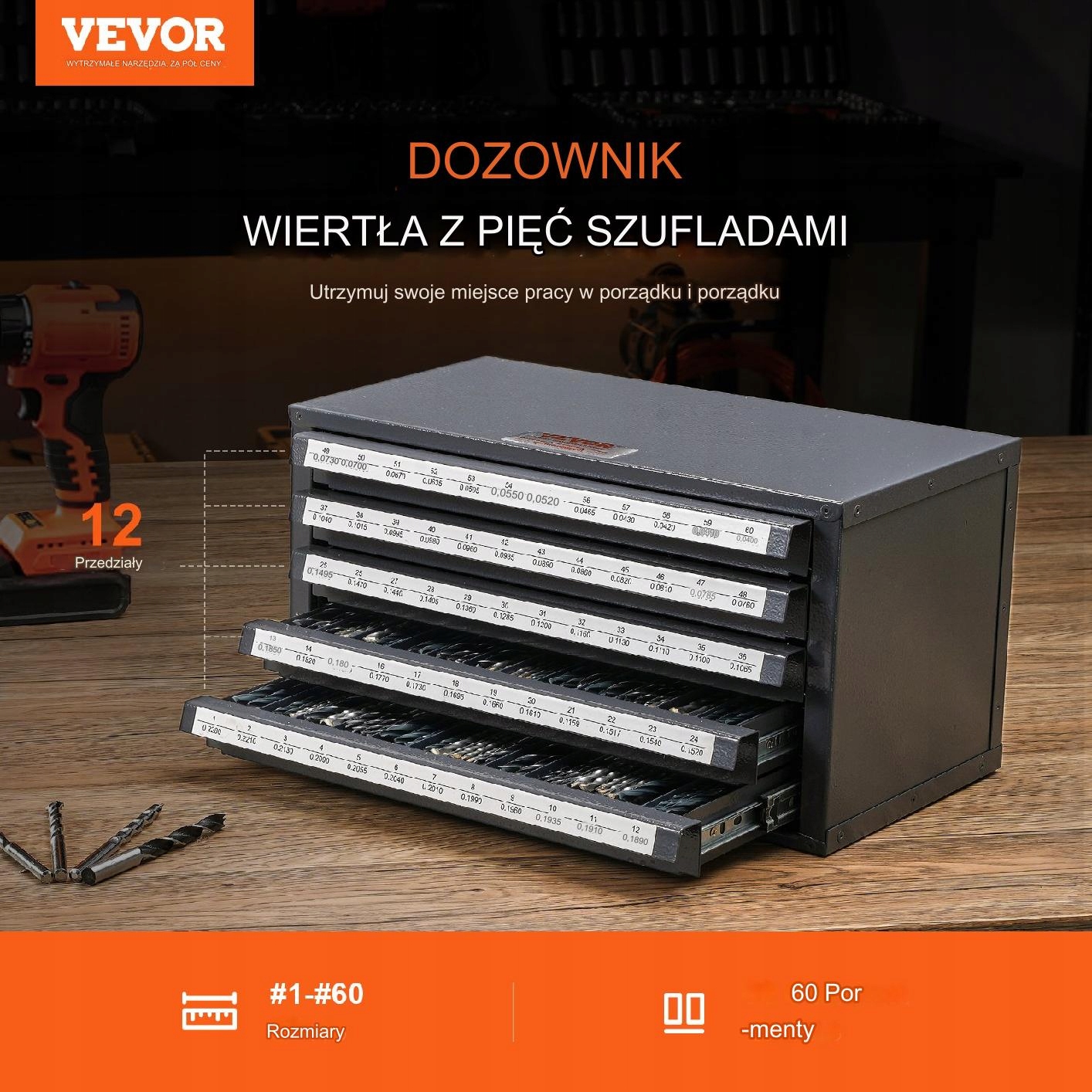 Ця шафа з диспенсером для дрилів має п’ять містких ящиків, у яких можна зберігати свердла від №1 до №60 із загалом 60 відділеннями. У кожне відділення вміщується одна дриль або інші аксесуари. Ці відділення забезпечують чітке розташування для різних розмірів і типів.