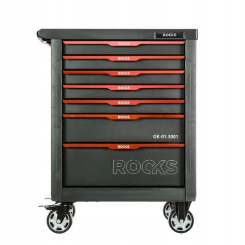 Система блокування шухляд і центральний замок гарантують, що шафа буде стійкою і міцно стоїть на землі. Цьому сприяють широкі алюмінієві колеса з двома гальмами та фіксатором повороту та обертання. Гальмо дуже ергономічне і просте у використанні. Шафа оснащена міцною профільованою ПП стільницею з ергономічною ручкою для керування шафою.