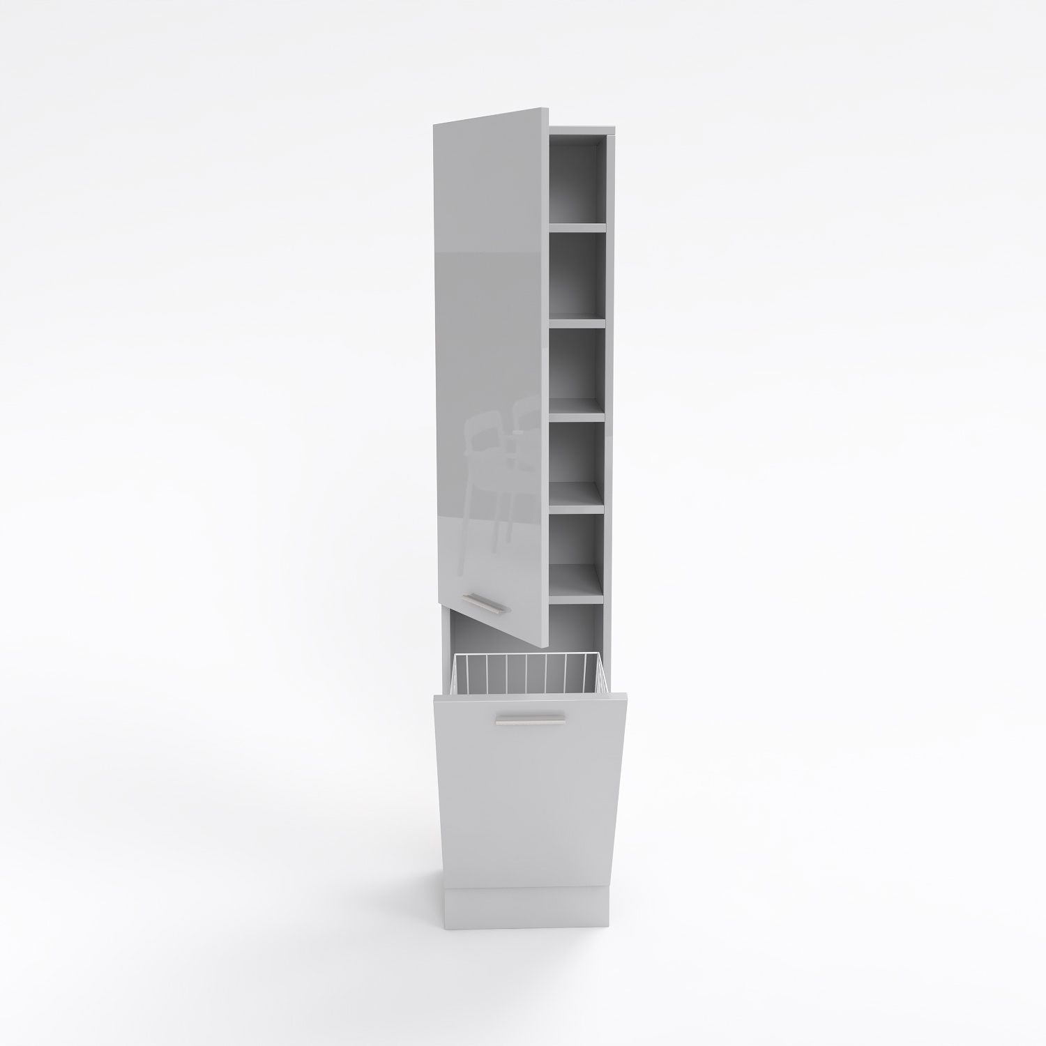 Шафа, стійка з кошиком для брудної білизни. Верхня частина оснащена регульованими полицями.Шафа виготовлена з високоякісного МДФ, покритого УФ-лаком, і ламінованої плити. Краї обклеєні ПВХ кантом. Висока якість глянцю понад 100 голосів. Глянцеві елементи покриті захисною плівкою. Меблі готові до самостійної збірки, яка є простою та інтуїтивно зрозумілою, в її основі лежить система дюбелів та ексцентриків, які не потрібно склеювати, виріб можна розібрати та зібрати в будь-який момент, в упаковці є інструкція з експлуатації на 3 мовах. Боковини шафи однорідні без отворів зовні, що підвищує естетичність виробу. Шафа підходить для навішування. Ми не використовуємо кришки всередині, щоб зменшити кількість пластику. Після упаковки шафи все одно технологічних дірок не видно. Упаковано по 2 упаковки.