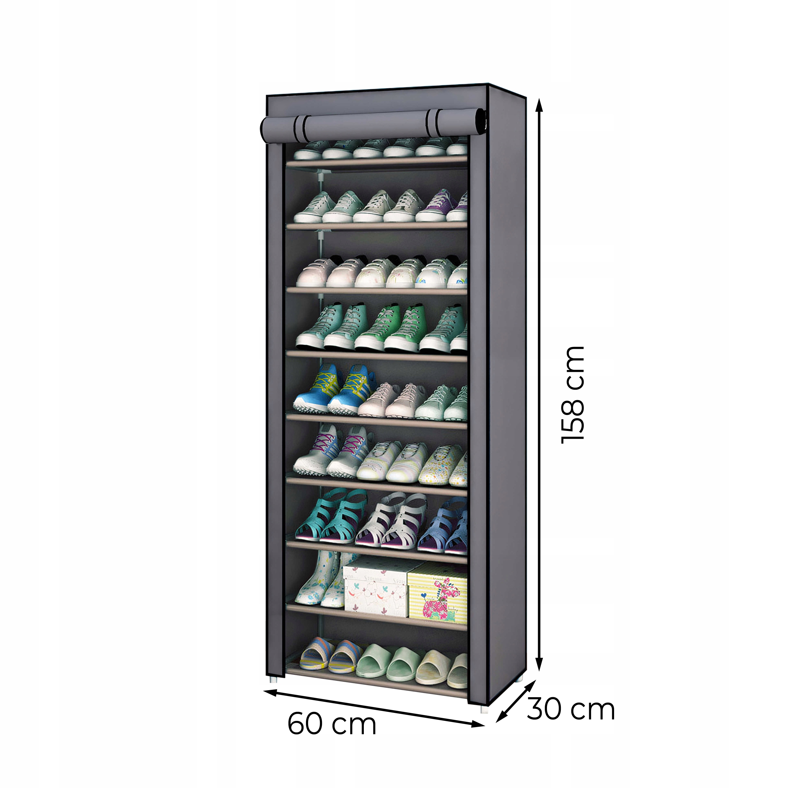 Стійка для взуття з тканинним покриттям має розміри 30x60x158 см, висока та вузька, має 9 полиць, що дозволяє зберігання до 27 пар взуття. Він оснащений спеціальним захисним чохлом і, крім того, поличкою для взуття на блискавці забезпечує захист від пилу. Наша взуттєва шафа не тільки вміщує вашу колекцію взуття, але й додасть елегантності та порядку вашому дому.
