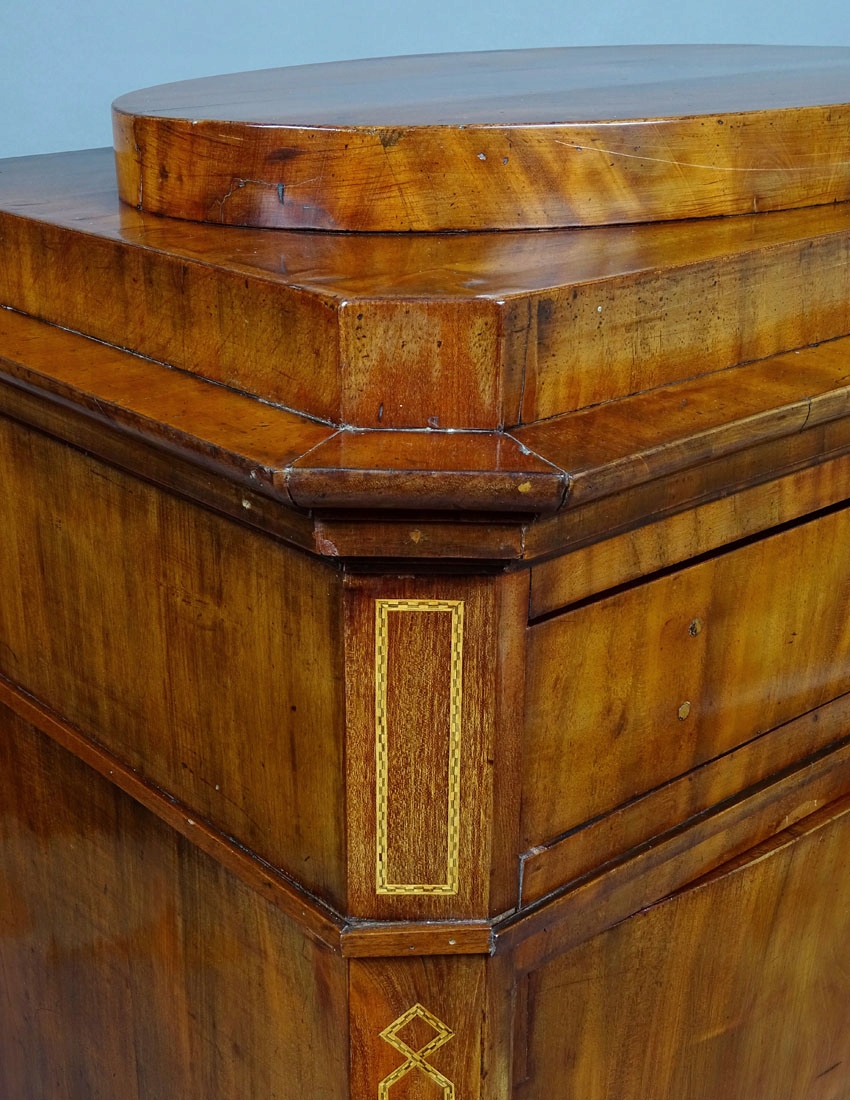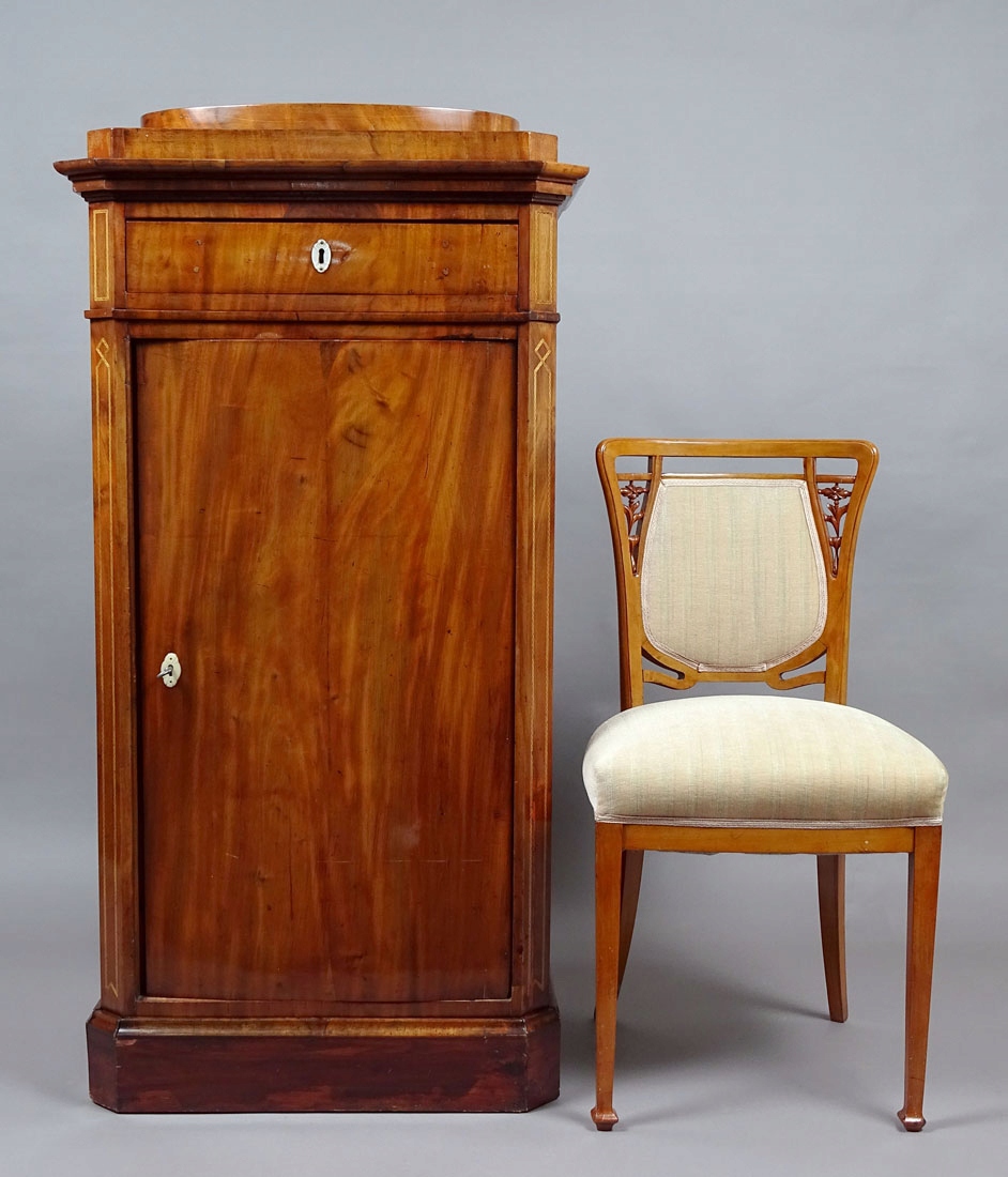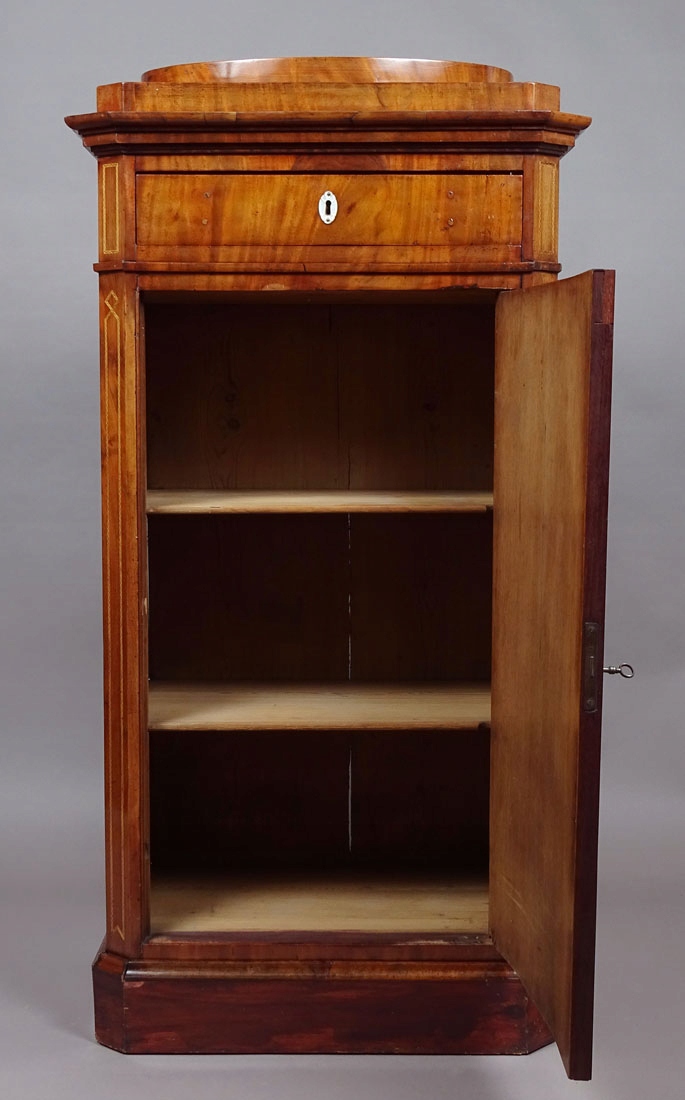 з простою рамою, закривається однією, плавно вигнутою дверцятами з одним висувним ящиком у верхній частині, все спирається на масивний плінтус. Шухляда з прямою гранню, на замок, зі сталевим врізним замком і ключем, як і двері. Боковини меблів прямі, передні кути зрізані, прикрашені тонкими дерев'яними прожилками. Вгорі подвійний дах, перший у формі меблевої конструкції, зверху овальний, з двома полицями всередині.