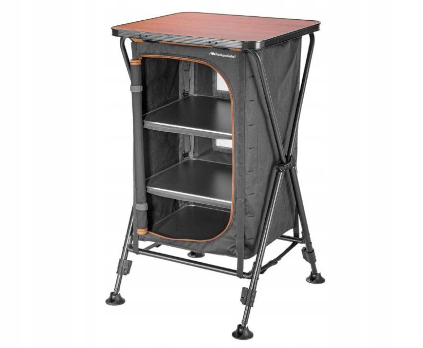 Стійка і функціональна кемпінгова шафа з алюмінієвим каркасом і ПВХ тканиною з покриттям 600D ripstop, призначена для зберігання туристичного спорядження. Легка складна конструкція займає мало місця у вашому багажі. Ідеально підходить для кемпера, намету, кемпінгу чи садової ділянки.