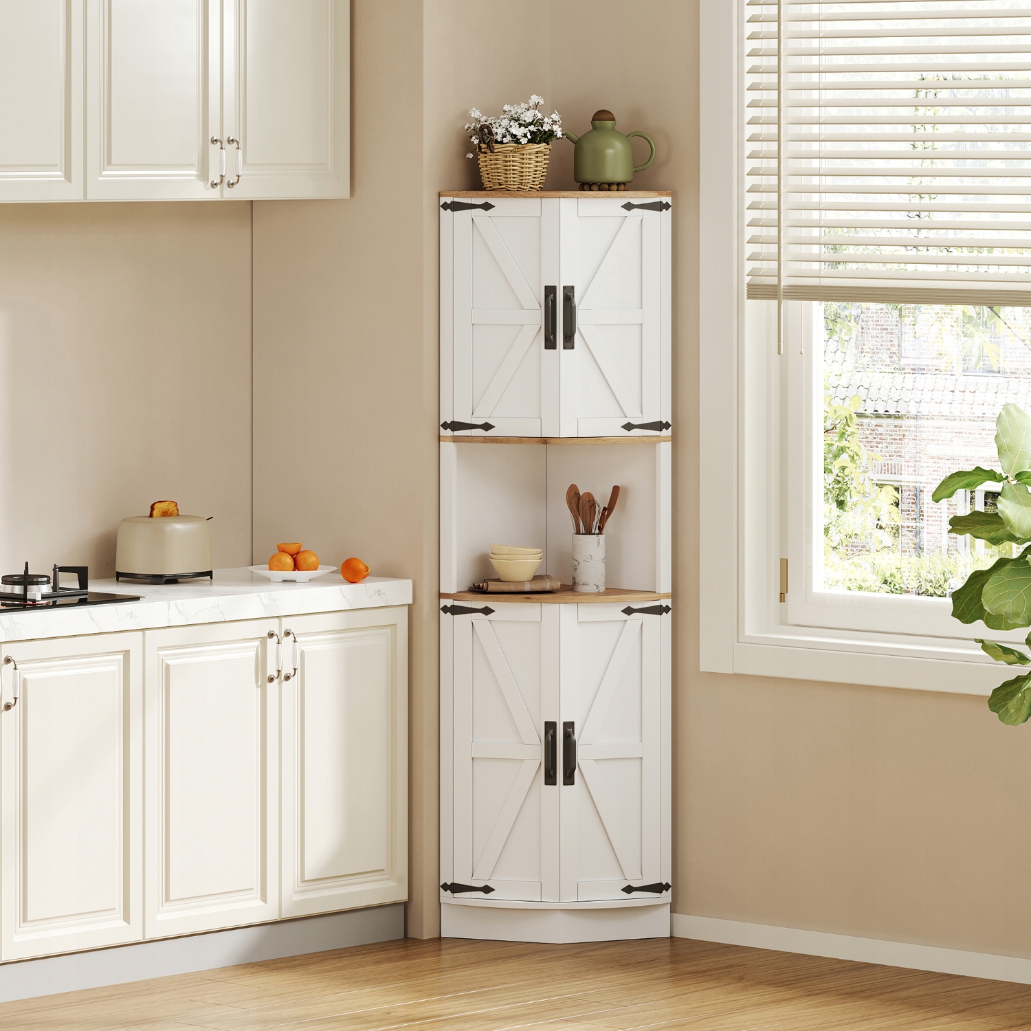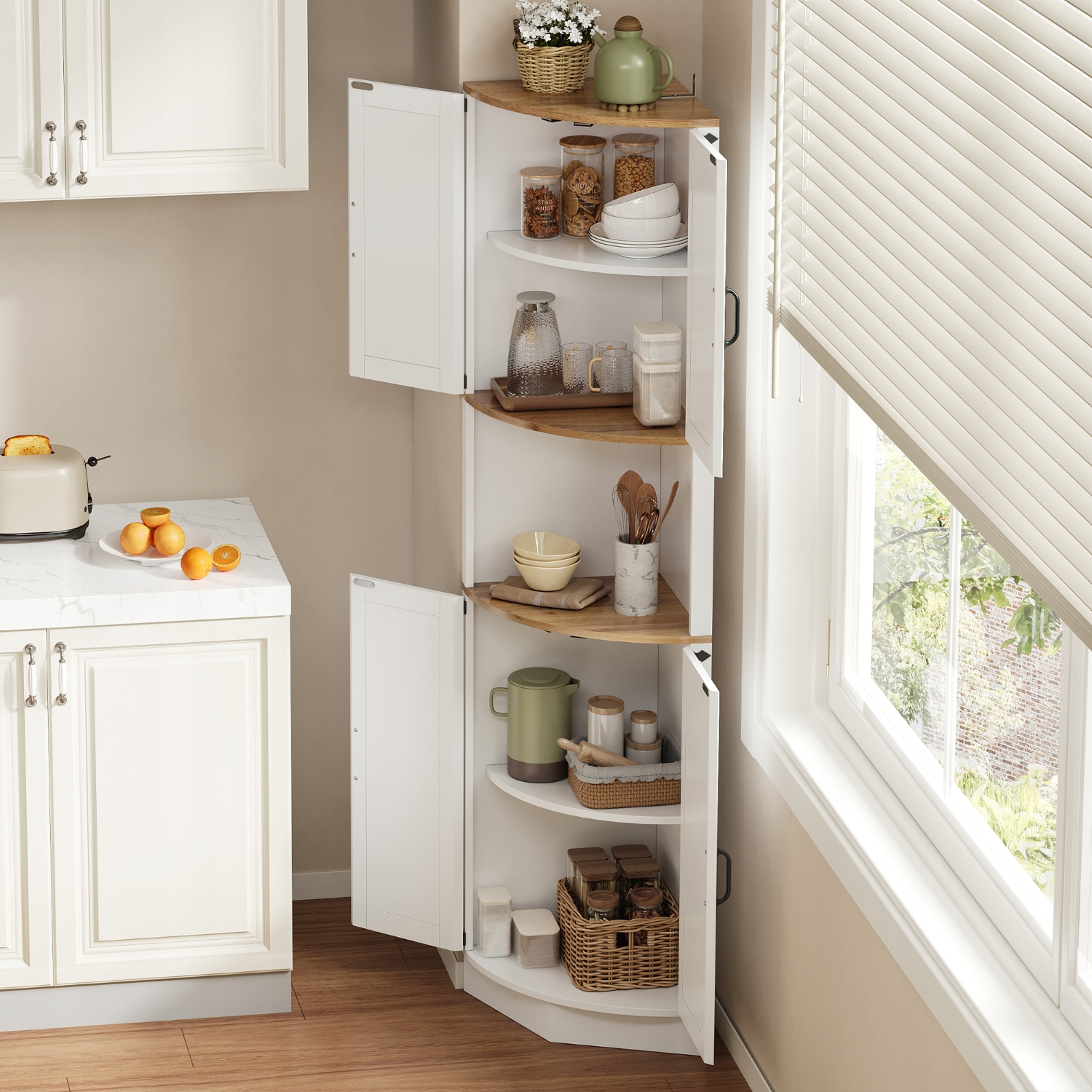 - Кутова конструкція, що економить простір – Ця висока шафа розміром лише 39,5 x 39,5 x 180 см ідеально підходить для використання невикористаного кутового простору, що робить її ідеальною для невеликих кухонь, віталень і їдалень.