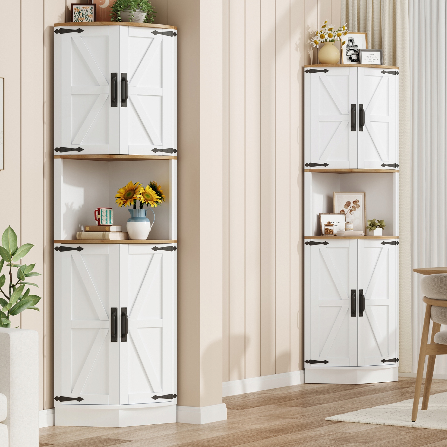 - Вінтажний сільський стиль - Біла обробка шафи ідеально поєднується з темно-коричневим деревом і класичними дверцятами в рамах. Чорні вінтажні ручки та петлі додають унікального характеру.