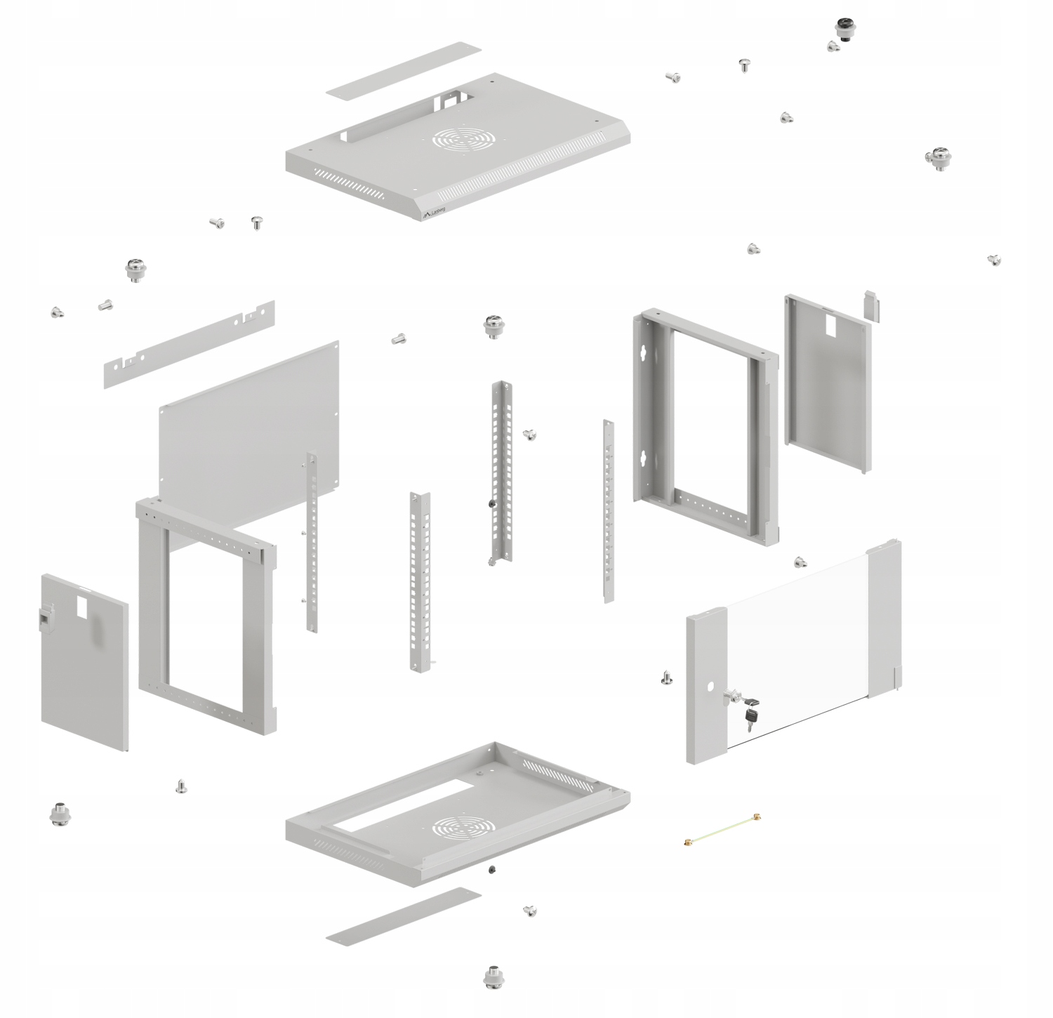 Засклені дверцята спереду та доступ з боків і ззаду шафи через знімні бічні панелі та знімну задню панель забезпечують як високу функціональність, так і захист пристроїв від випадкового вимкнення чи пошкодження. Крім того, можливе кріплення шафи безпосередньо на стіну (через отвори в каркасі) або за допомогою спеціальної планки, що значно полегшує установку в різних умовах.