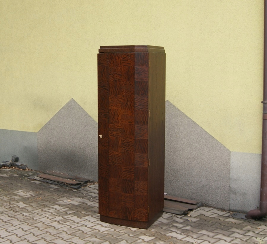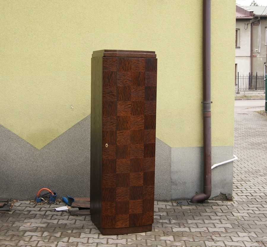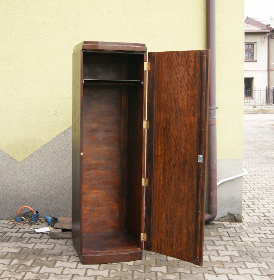 Предметом сьогоднішнього аукціону є шафа-купе міжвоєнного періоду, виготовлена з дерева з натуральним шпоном дуба та берези, після свіжого ремонту. , напівматове покриття. Свіжий салон і чистий, функціональний замок. Шафа обладнана штангою з вішалками.