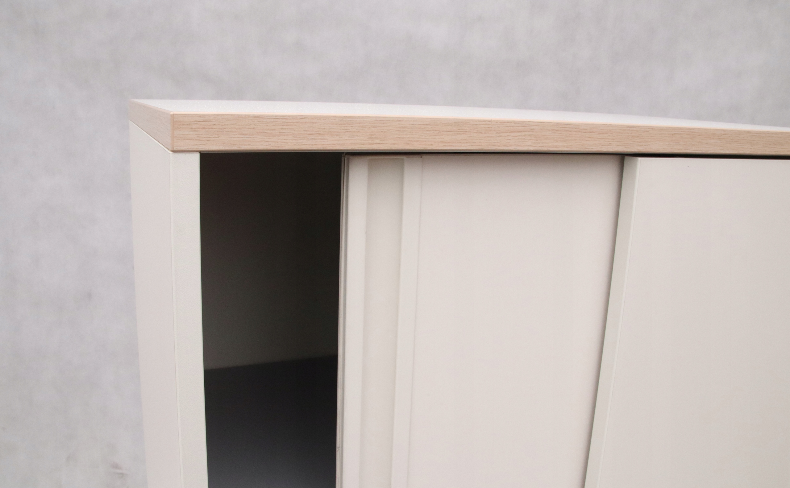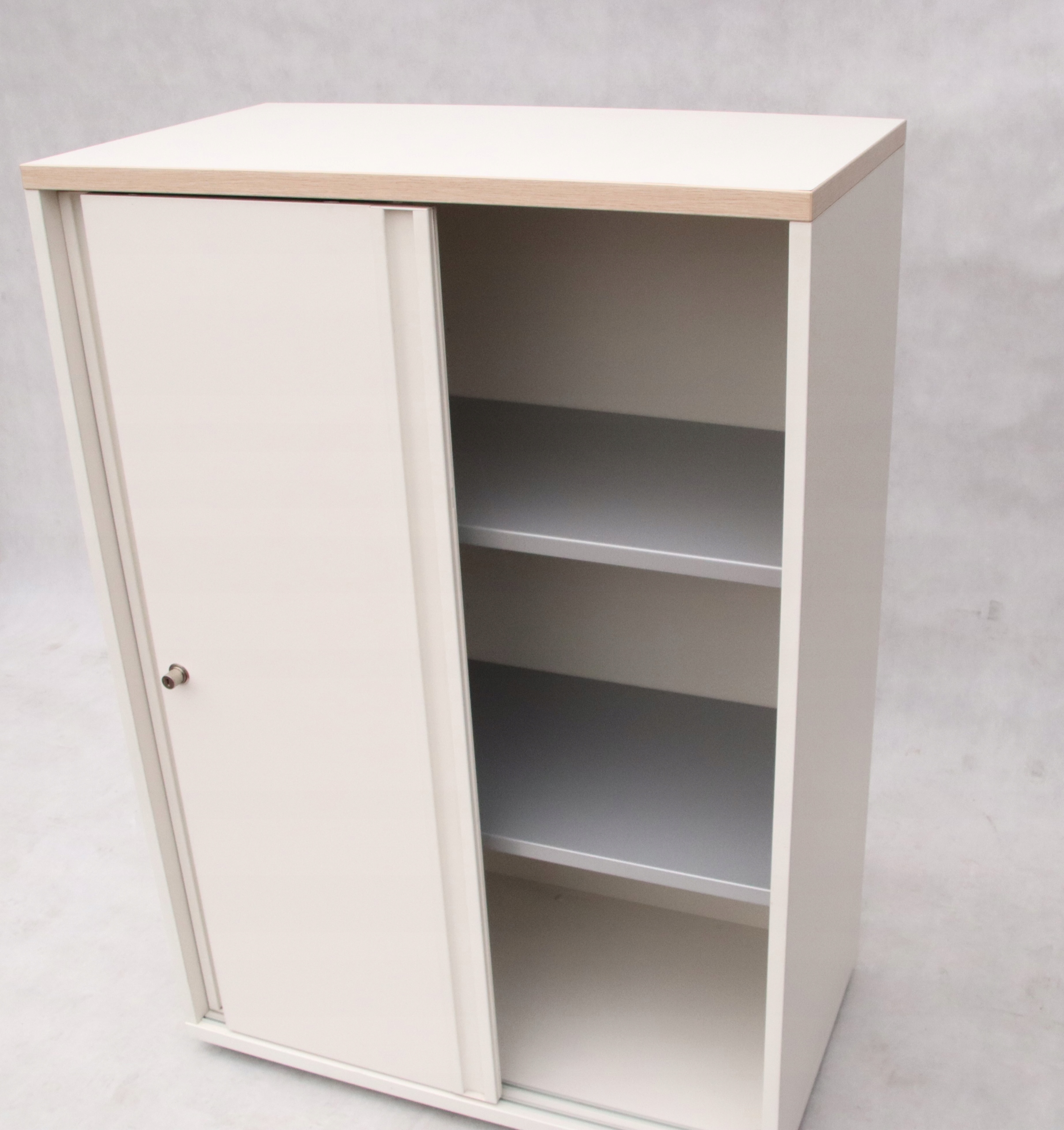Місткий комод Haworth виготовлений з високоякісних міцних матеріалів. Шафа однопросторна, закривається розсувними дверима. Завдяки такому рішенню відкриття можливе навіть у невеликих приміщеннях. Ключовий замок додатково захищає вміст. У просторому салоні є дві регульовані металеві полиці. Комод вміщає багато і допоможе організувати ваш офіс. Все це встановлено на ніжки для вирівнювання.