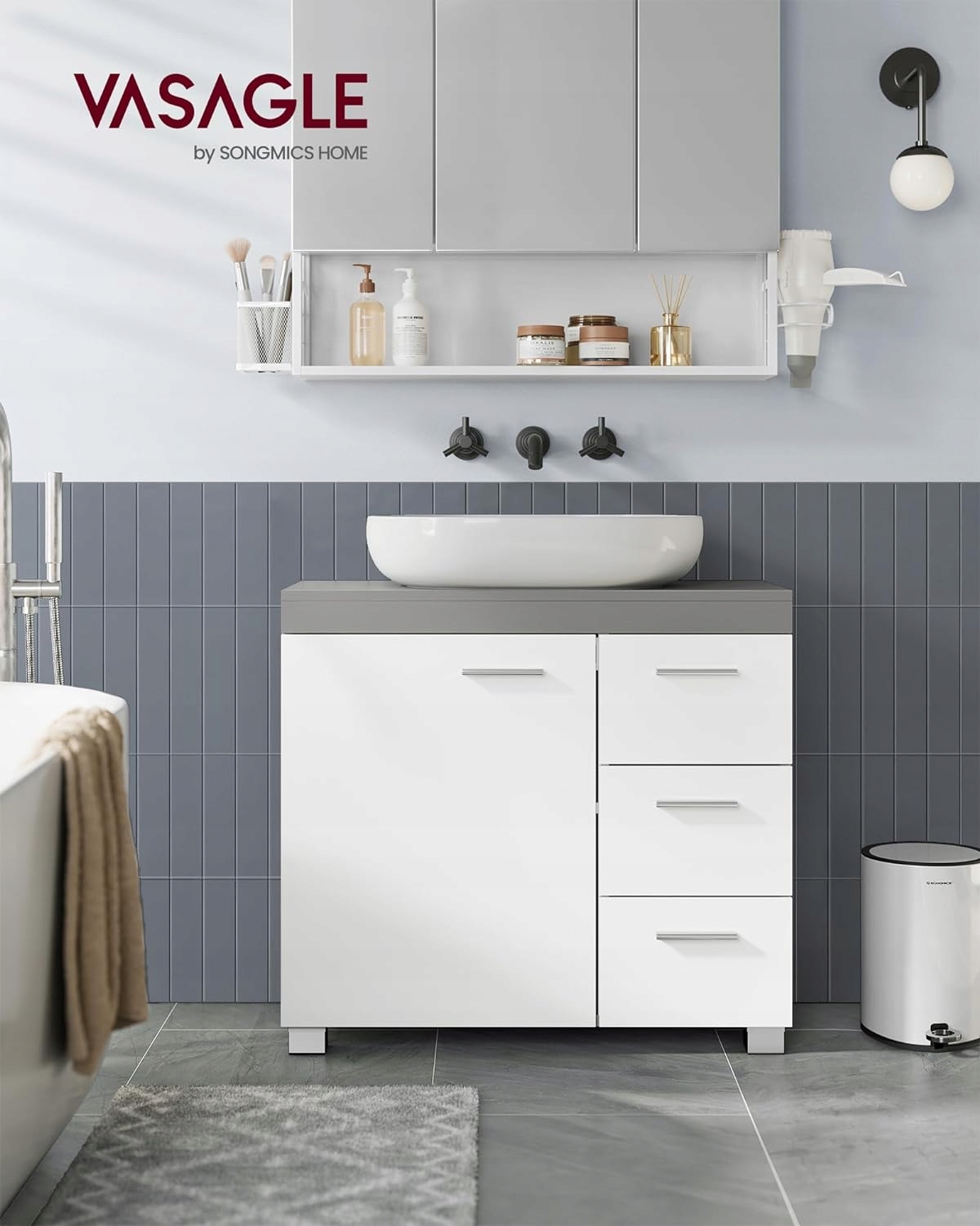 about this subject h1> - a lot of storage space : this cabinet under the sink with 3 large side drawers and 2 compartments behind the door of the cabinet provides a lot of space for storing bathing utensils, towels, etc.