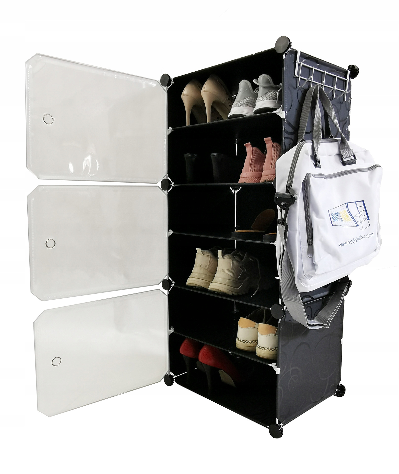 Кожен модуль оснащений прозорими дверцятами. Це рішення не тільки захищає вміст від пилу, бруду та вологи, але також дозволяє користувачам легко знайти потрібну пару взуття, навіть не відкриваючи дверей.