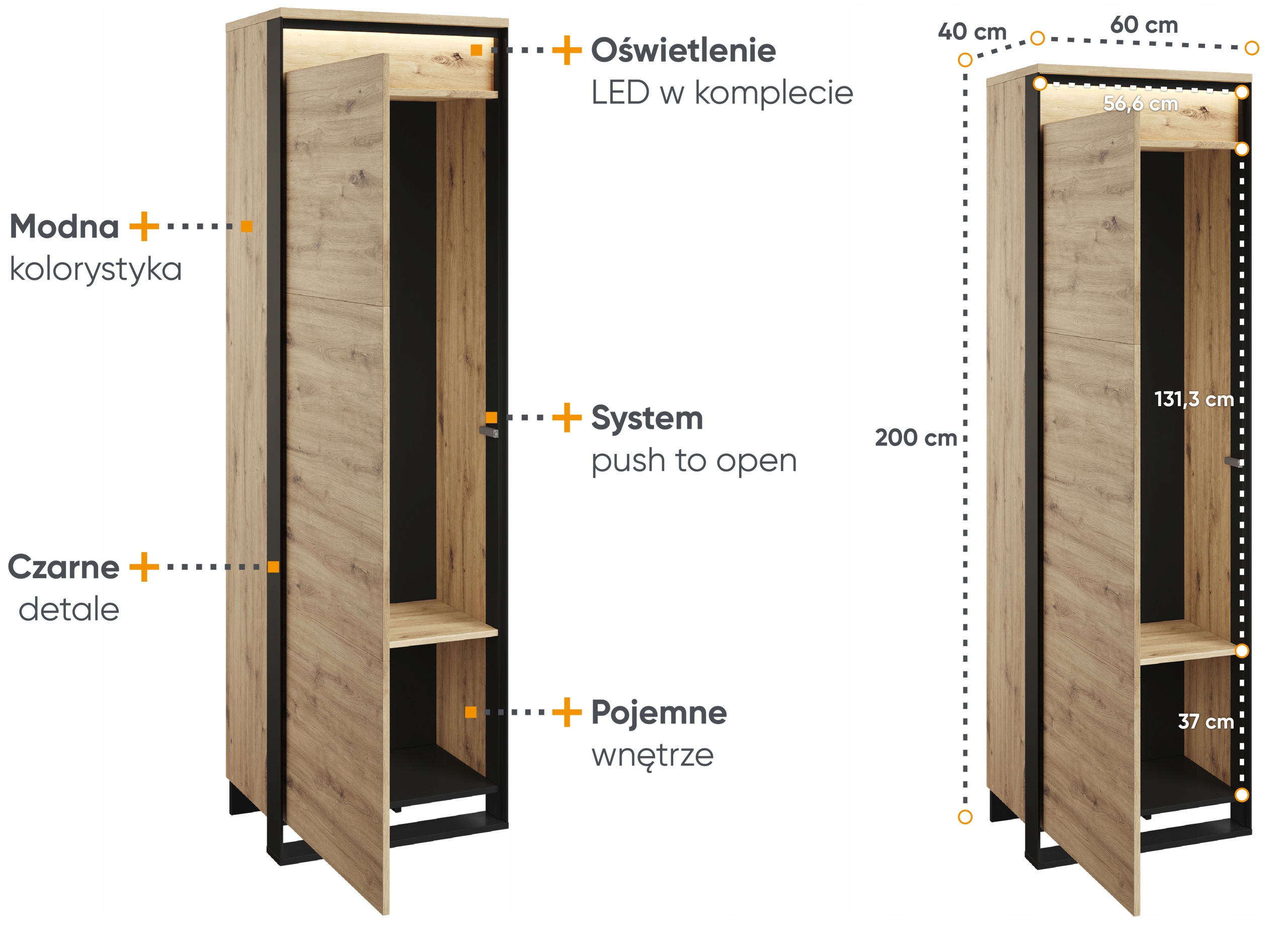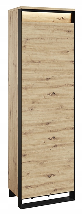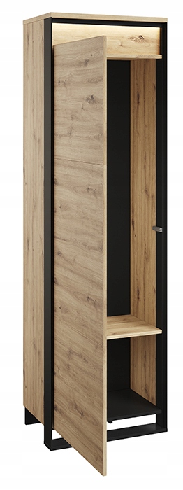 Компактнаоднодверна шафа з полицею та Світлодіодне освітлення. Невеликі розміри шафи-купе дозволяють помістити меблі в будь-яку кімнату. Оригінальний декор, чорний, тонкі підставки та тривимірний фасад надають меблям характер лофт. Розсіяне світлодіодне освітлення підкреслює сучасний стиль гардеробу, а вечорами створює затишну атмосферу в інтер'єрі. Шафа виготовлена з міцної ламінованої плити з оздобленням міцною кромкою ABS. Комфортне використання забезпечується механізмом PUSH TO OPEN.