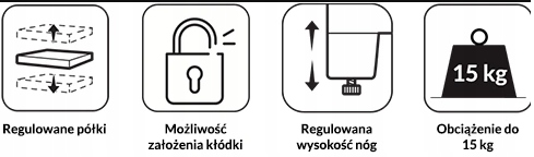 - Висока шафа обладнана 4 регульовані полиці навантаженням до 15 кг кожна. Регульовані ніжки та ергономічні ручки, стилізовані під метал, додають практичності та естетики. Додаткова безпека: ручки з навісним замком підвищують безпеку речей, що зберігаються.