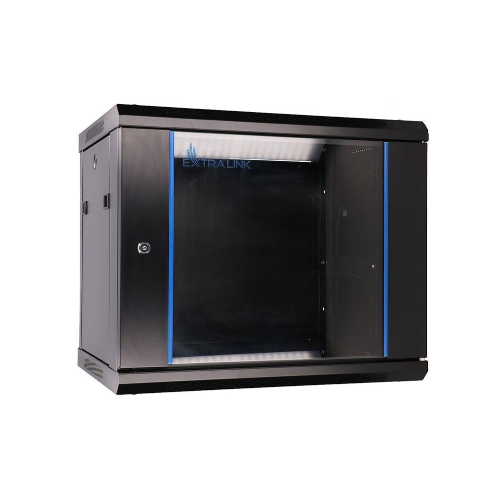 Стієчна шафа Extralink призначена для настінного монтажу в офісах, мережевих серверних кімнатах і кімнатах відеоспостереження. Зовнішні стіни виготовлені з листів холоднокатаної сталі. Передні двері, оснащені загартованим склом, можуть відкриватися вліво або вправо.