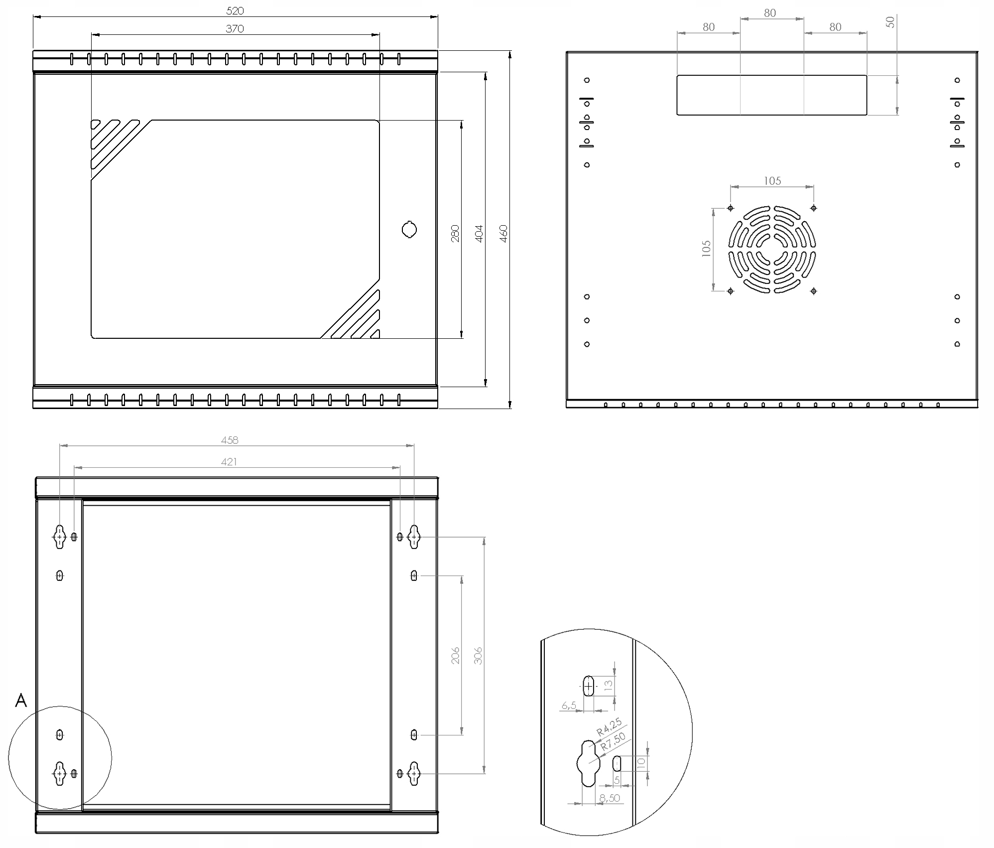 У нижній та верхній частині шафи 19" RACK є місце для встановлення вентилятора (не входить у комплект) розміром 120 x 120 мм (відстань між гвинтами: 105 x 105 мм). Це забезпечує належне розсіювання тепла зсередини шафи.
