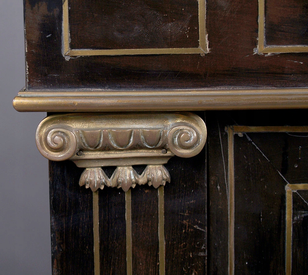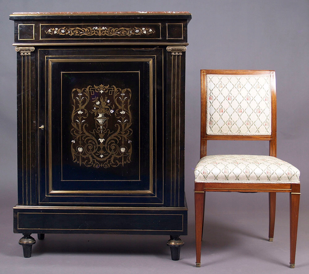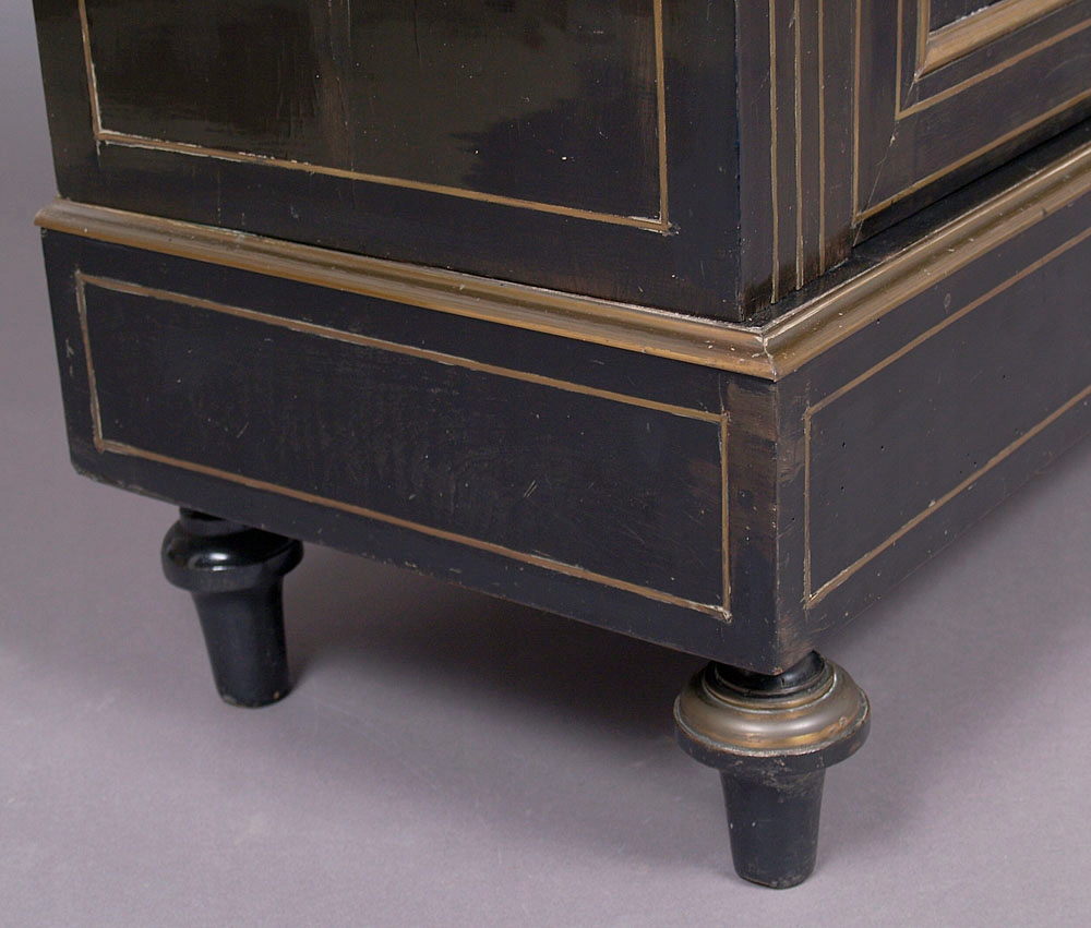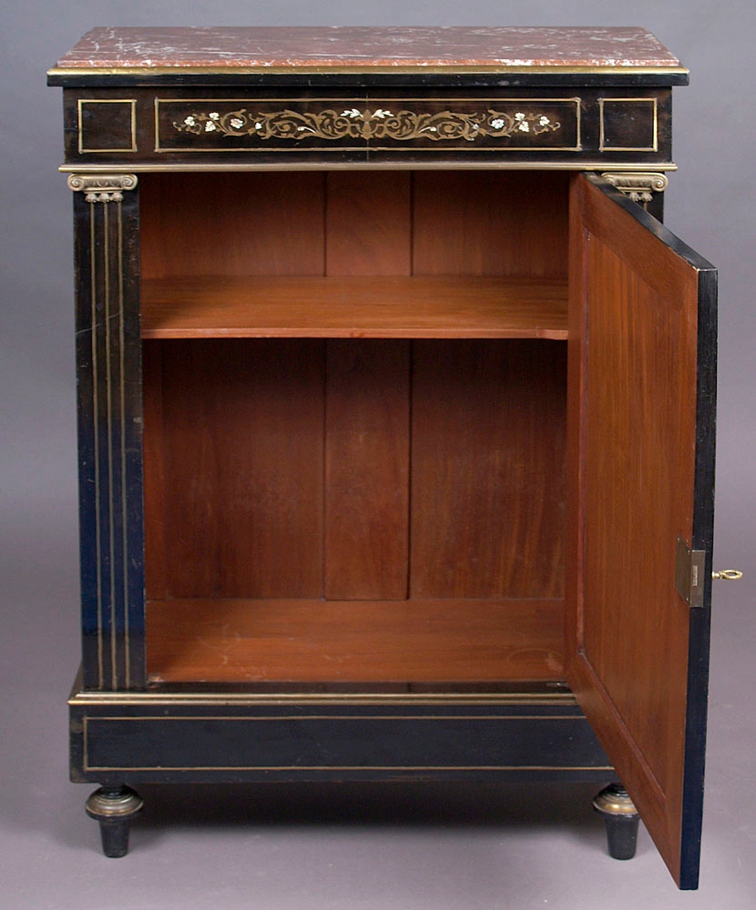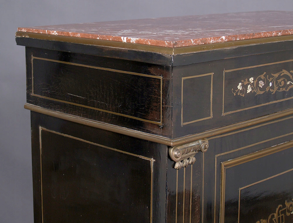 Конструкція з червоного дерева, почорніла, маркетрі з латунного листа та кістки. Латунна фурнітура, оригінальна мармурова верхня частина, близько 1900 року.