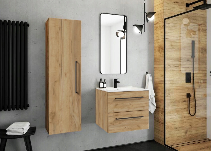 Висока тумба для ванної кімнати – це практичний предмет меблів, в якому можна розмістити аксесуари для ванної кімнати. Тильна сторона меблів захищена деревно-волокнистою плитою (HDF), яка є твердою та має підвищену стійкість до високих температур та вологи. ДСП, з якого виготовлена конструкція шафи, забезпечує захист від води, грибка та вогню. Крім того, цей матеріал легко підтримувати в чистоті.