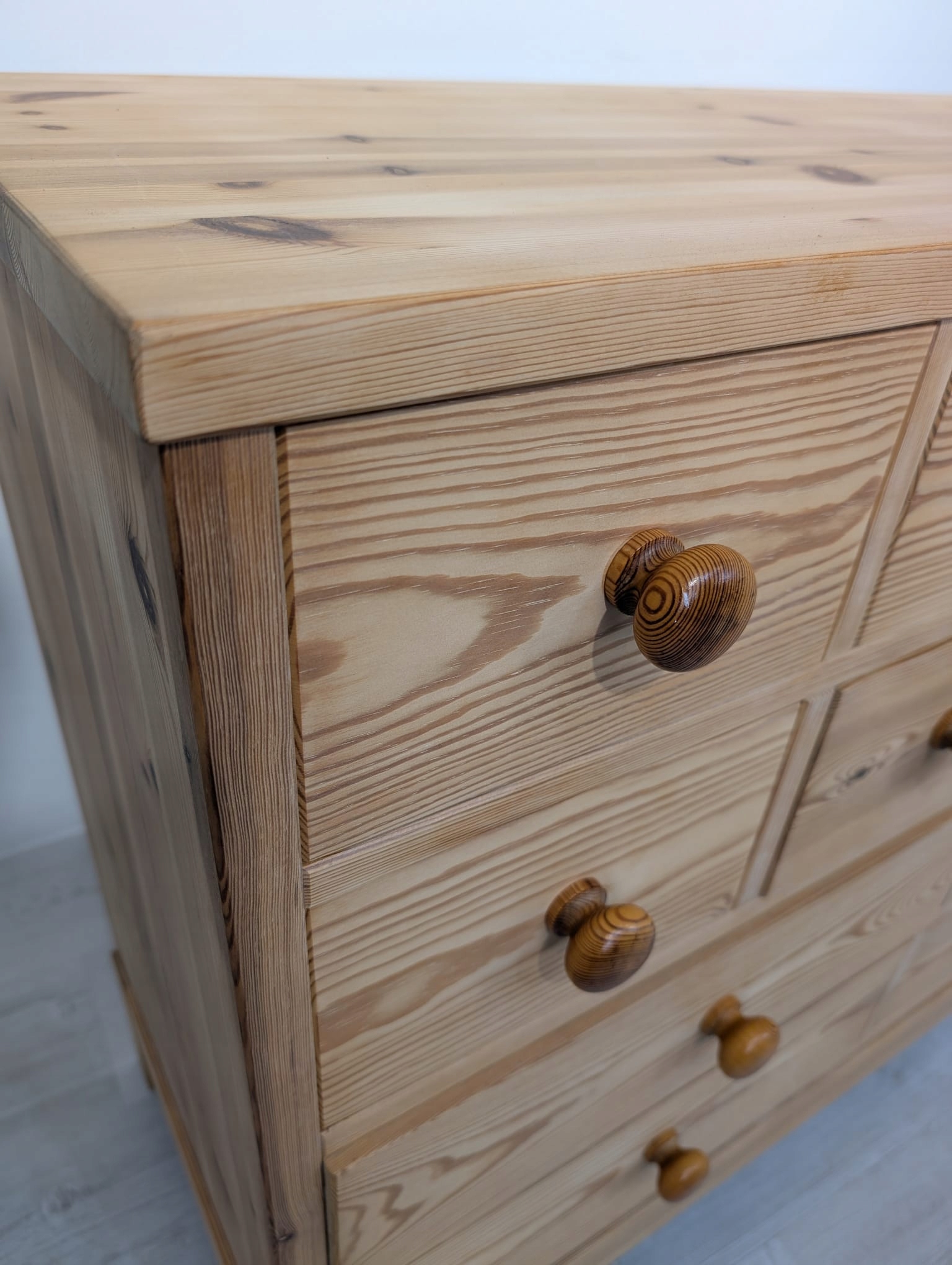 Міцний комод з необробленого дерева сосни. Він має 12 містких ящиків, які забезпечують багато місця для зберігання. Виготовлений з високоякісних матеріалів, він характеризується простим, але елегантним дизайном. Ідеально підходить для вітальні, спальні чи залу, додаючи сільського характеру інтер’єру.