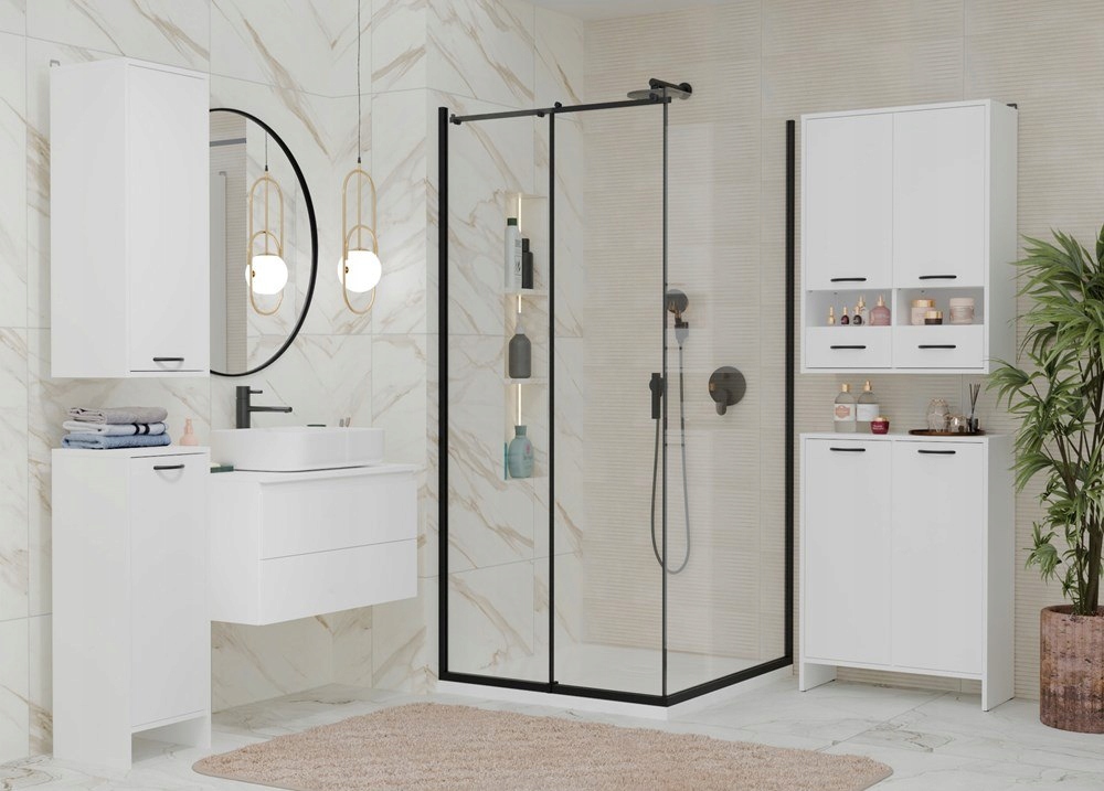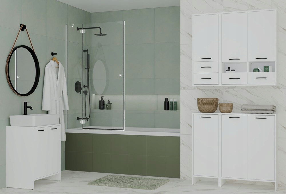 Сучасна та функціональна тумба для ванної NINA 1K1D - ідеальне рішення для зберігання косметики, засобів для чищення та брудного одягу в одному місці. Меблі поєднує в собі переваги двох моделей - з одного боку знаходиться практичний кошик для білизни, а з іншого три місткі полиці, що ховаються за цільними дверцятами. Все це в мінімалістичній, білій формі з чорними ручками, яка ідеально впишеться в будь-яку ванну кімнату.
