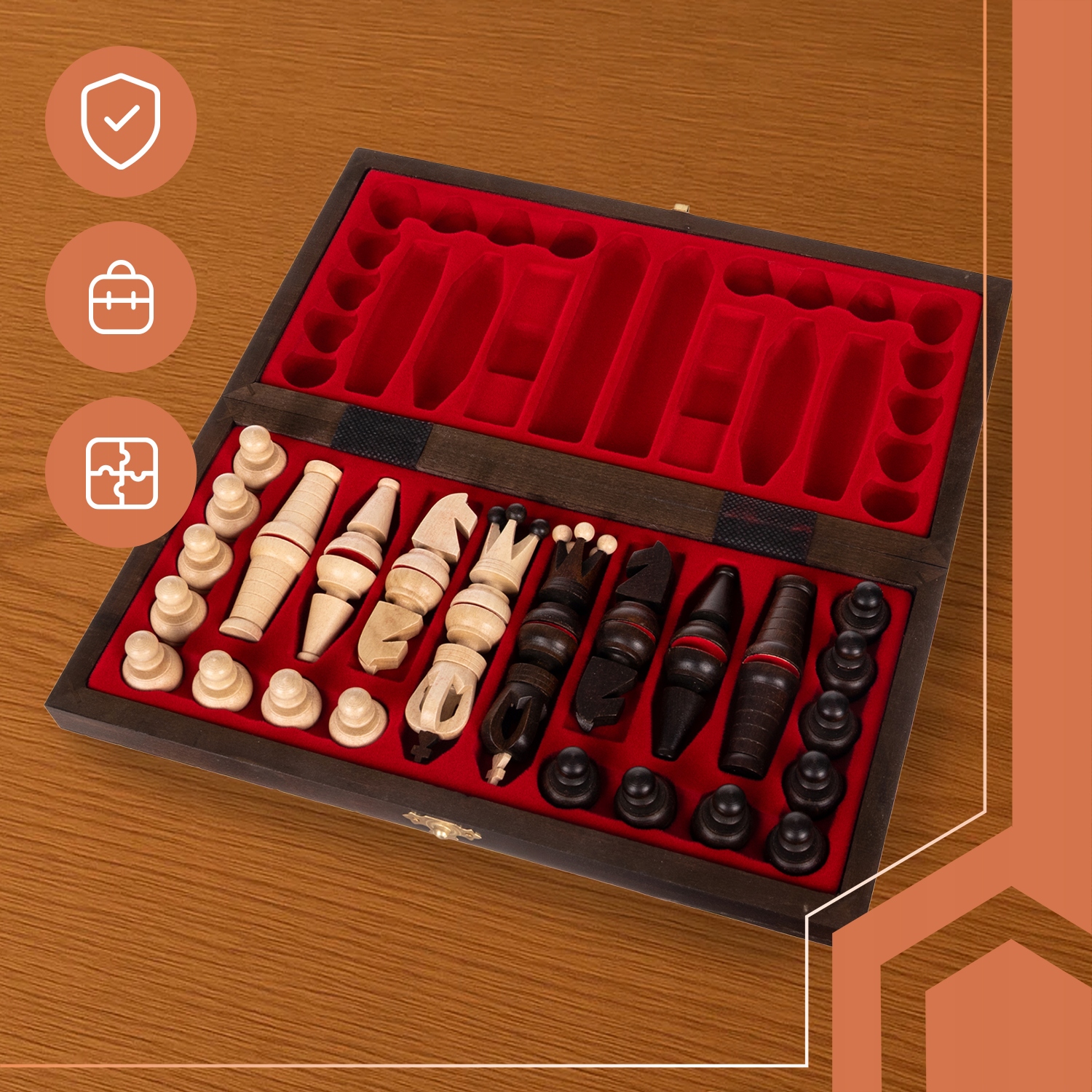 Набір містить флоковані вставки, які ідеально підходять для кожної фігурки та пішака. Завдяки їм елементи гри не зміщуються під час транспортування, що запобігає їх пошкодженню. Це практичне та елегантне рішення, завдяки якому шахи залишаються акуратними та довговічними.