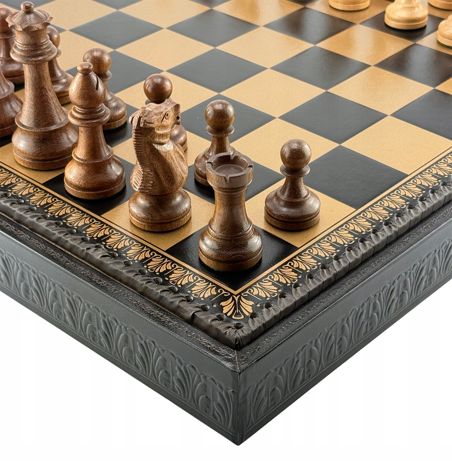 ІТАЛІЙСЬКІ ШАХИ ДЕРЕВО АКАЦІЇ CLASSIC PREMIUM+ШАХОВА ДОШКА ШКІРА ЗОЛОТО/ЧОРНИЙ 48
