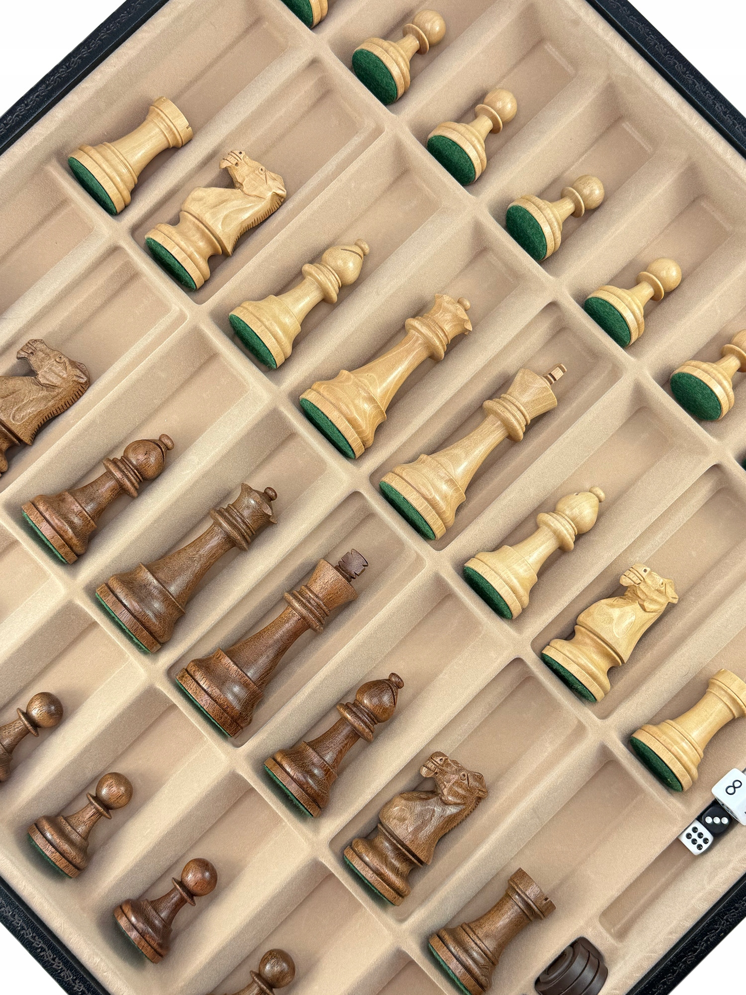 Шахи відомого італійського бренду Italfama. Дошка виготовлена з екологічної шкіри. Розмір дошки: 48 х 48 х 5,5 см, розмір поля: 5,2 см. Фігурки з колекції "Classico Palissandro Dorato" виготовлені з дерева та додатково обтяжені. Висота короля: 10,2 см, діаметр 3,8 см. У набір також входять шашки та нарди.