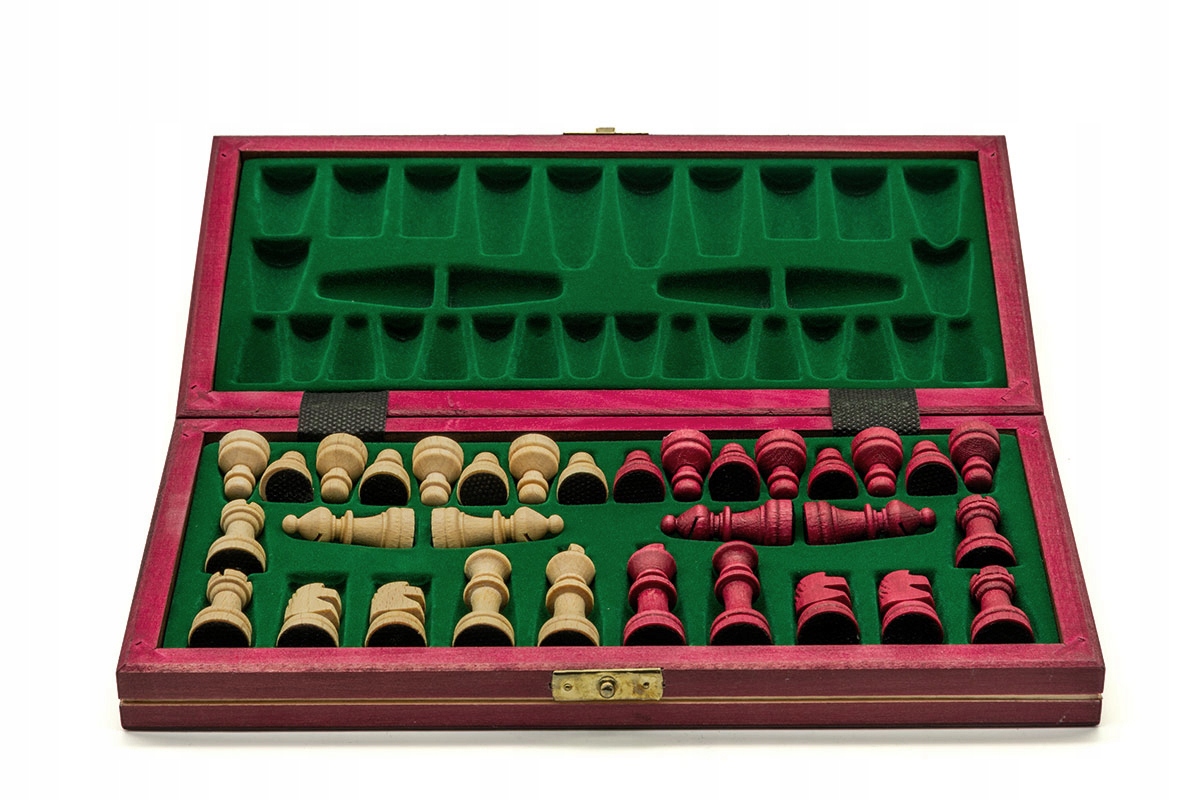 У набір входить касета з шаховою дошкою, набір шахових фігур білого та вишневого кольорів по 16 штук.