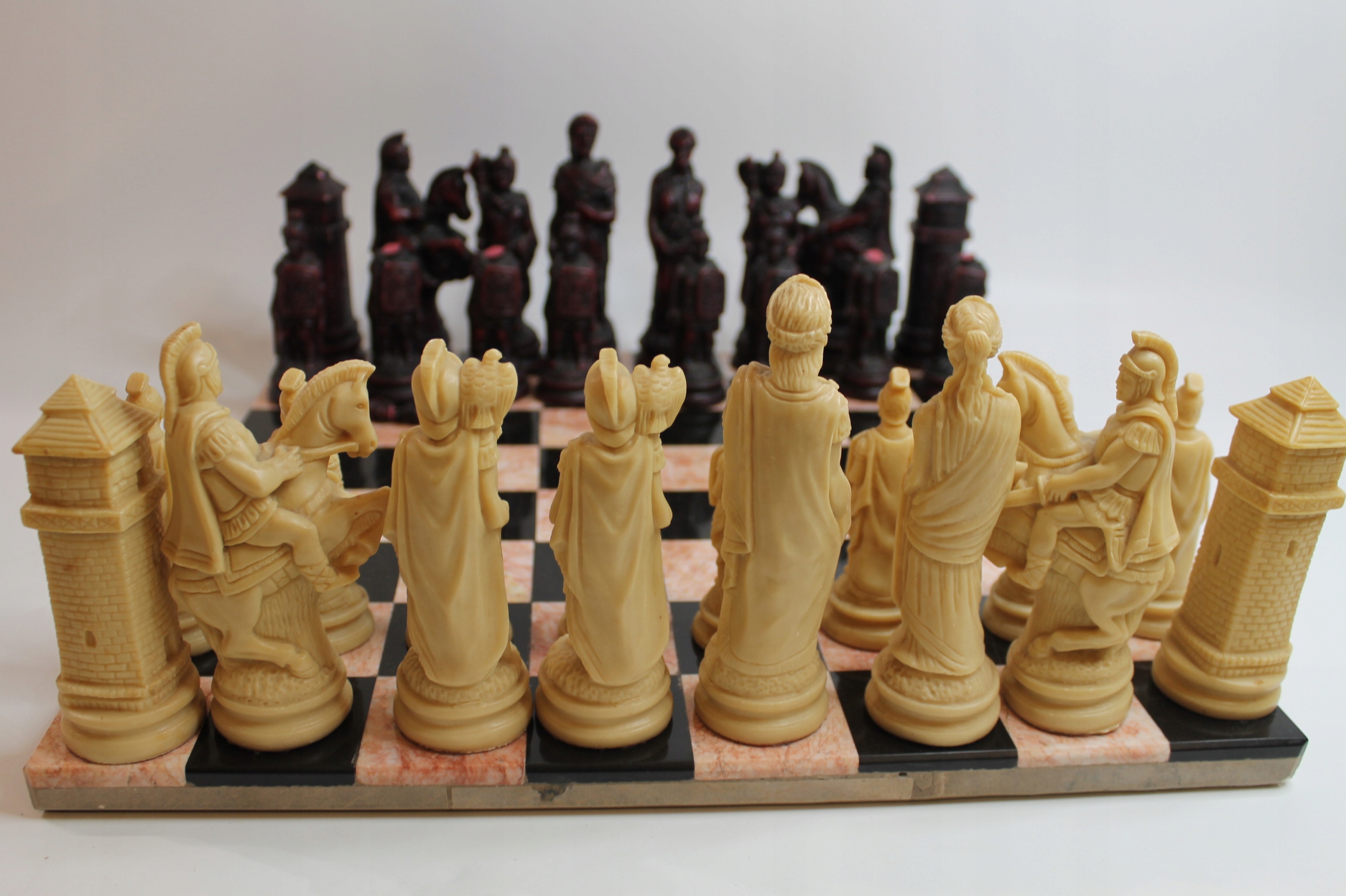 Тема продажів - це унікальна, зроблена з надзвичайною турботою про шахи. Фігури, зроблені з кам'яної смоли. Чотири пошкоджені статуетки.