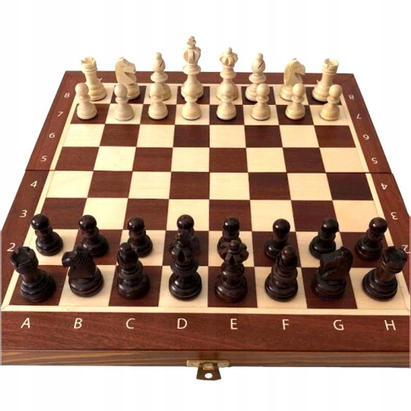 Набір шпонованих дерев'яних шахових фігур. Складна дошка, в якій можна зберігати фігурки. Розмір дошки: 34,5 х 34,5